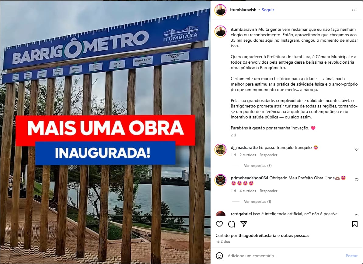 Também pelas redes sociais, o ‘Barrigômetro’ foi “celebrado” na página do comunicador social @itumbiaravish, que dedicou uma postagem ao “marco histórico para a cidade”, reconhecendo sua “grandiosidade, complexidade e utilidade incontestável”:
