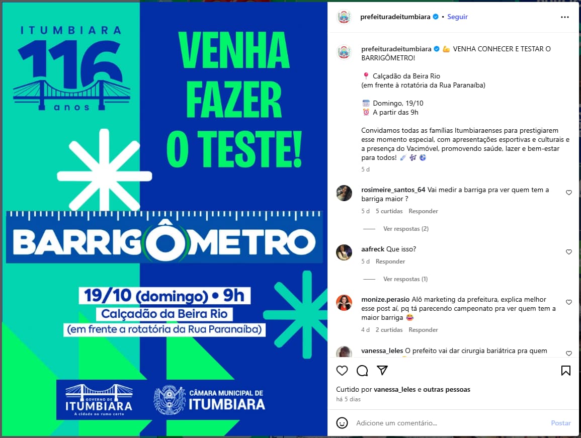 Outro alerta que se acende para as prefeituras é sobre a forma de se comunicar com seu público. Tanto a postagem no site quanto no Instagram não trazem uma mera linha de texto explicando para que serve, a quem se destina, qual é o benefício do ‘Barrigômetro’.