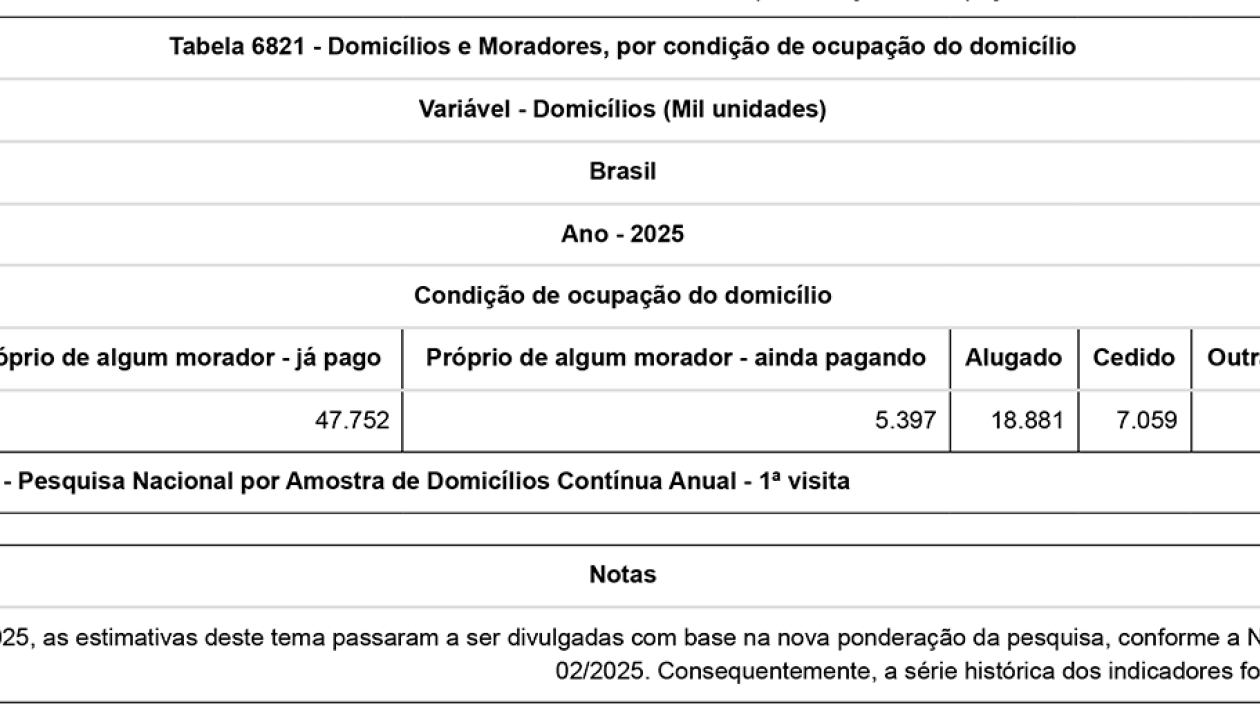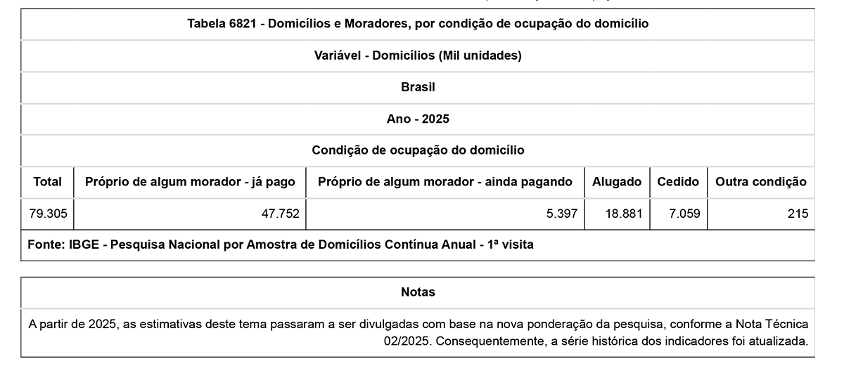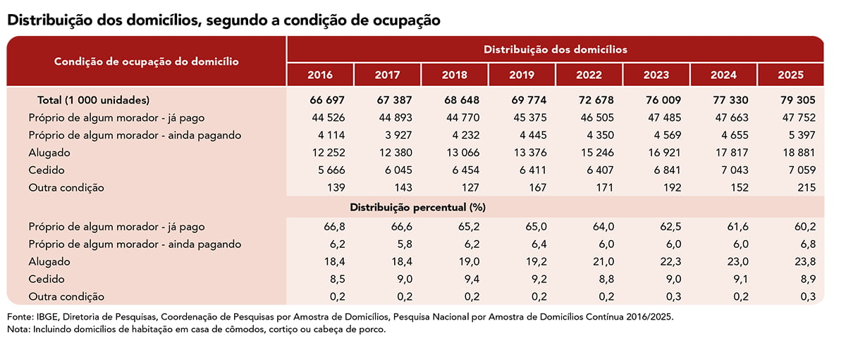 - O número de domicílios alugados cresceu 54,1% de 2016 para 2025, enquanto o de domicílios próprios ainda pagando teve elevação de 31,2%.