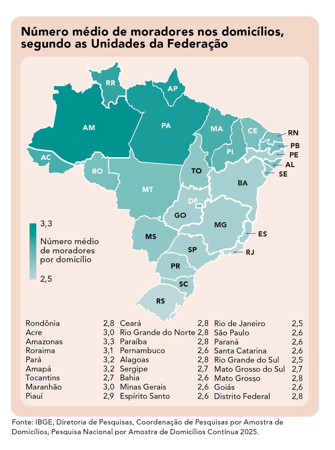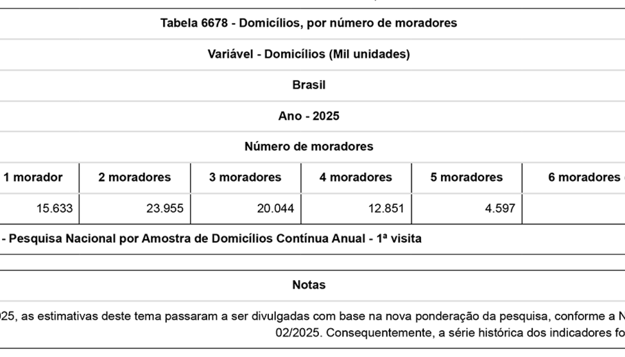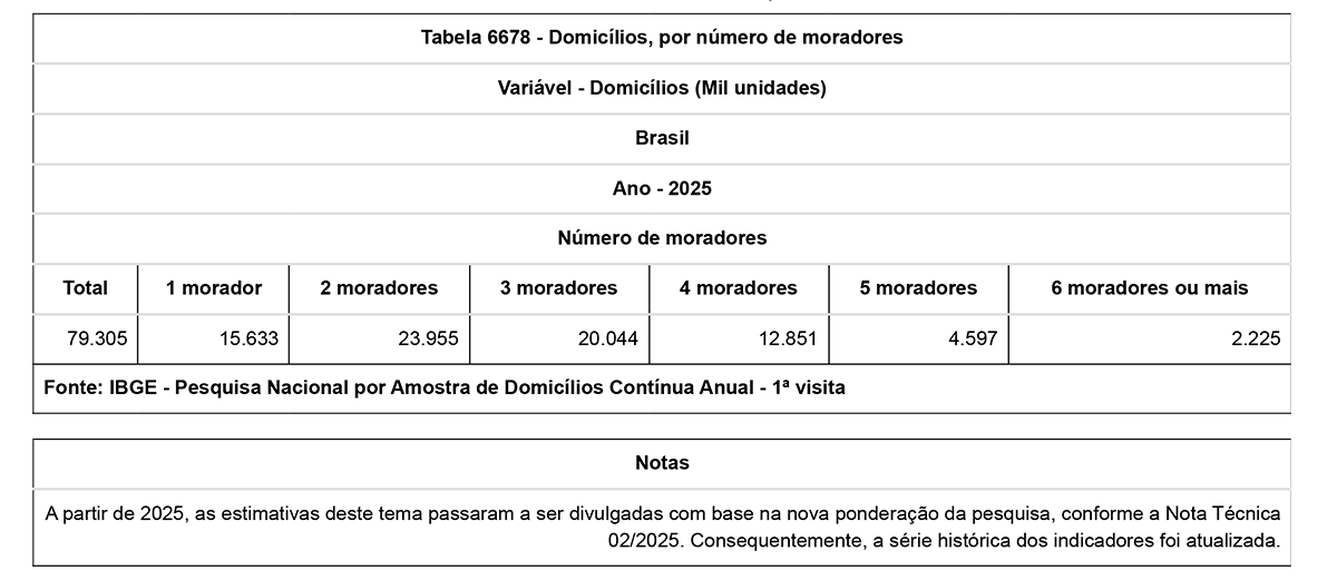 - As unidades domésticas unipessoais, compostas apenas por um morador, passaram de 12,2% para 19,7%, um crescimento de 7,5 p.p. de 2012 para 2025 (8,2 milhões de domicílios a mais).