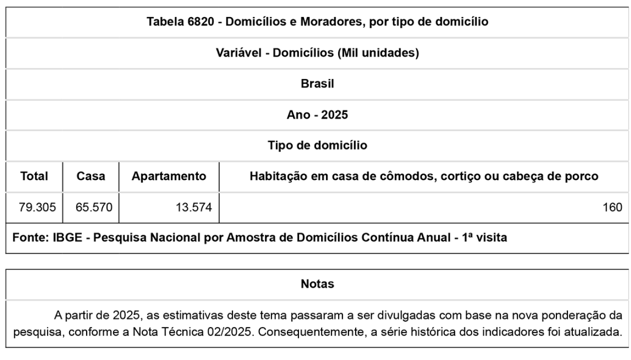 Também houve mudança no tipo de habitação: as casas ainda predominam, mas recuaram para 82,7%, enquanto apartamentos subiram para 17,1%.
