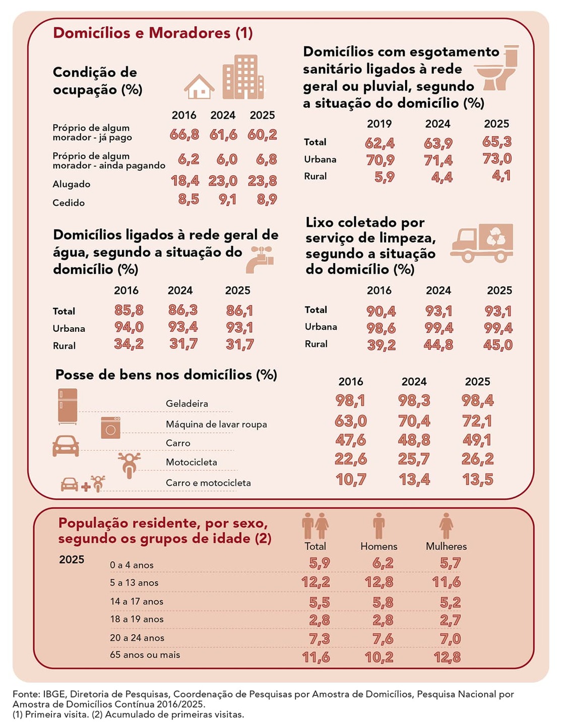 A pesquisa também mostra aumento no acesso a bens duráveis. Em 2025, 98,4% dos domicílios tinham geladeira e 72,1%, máquina de lavar. Em 2016, esses índices eram 98,1% e 63%, respectivamente.