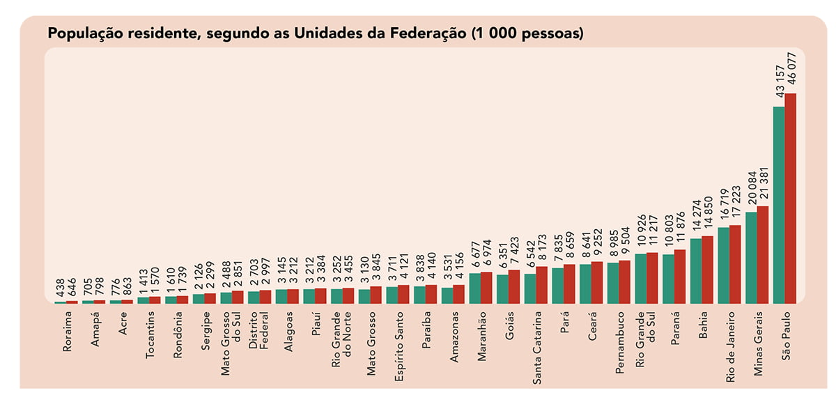 No ano passado, a população residente foi de 212,7 milhões de pessoas, aumento de 0,39% em relação a 2024. A taxa de crescimento tem ficado abaixo de 0,60% desde 2021. Do total, 51,2% eram mulheres e 48,8% eram homens.