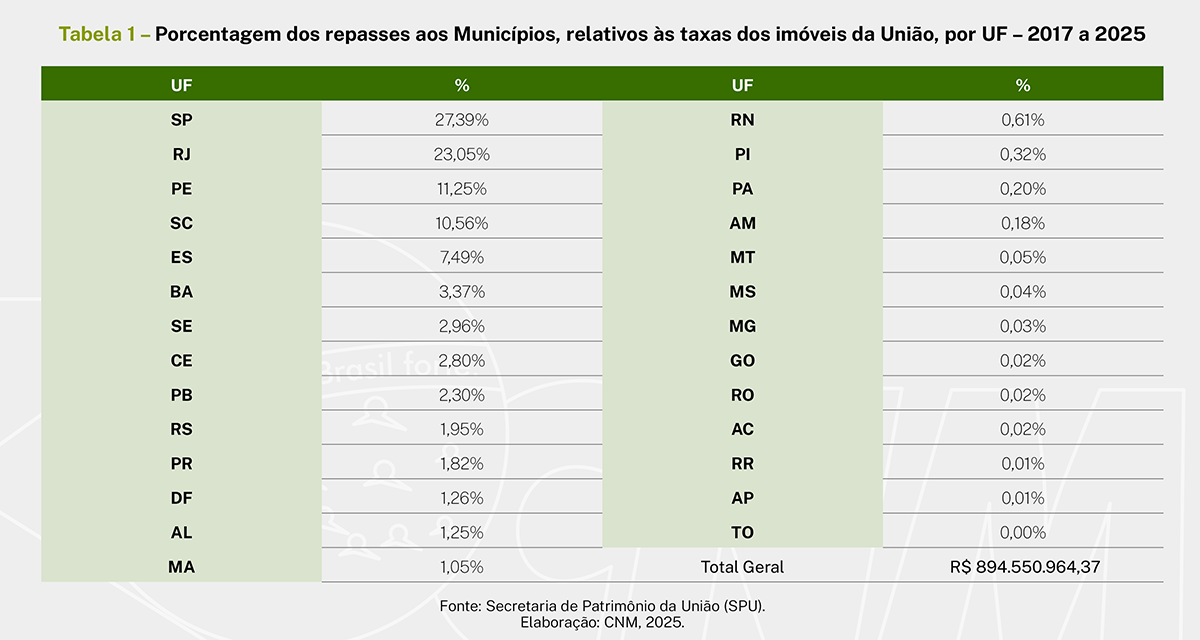 Dos municípios que receberam os repasses, 50,44% são dos estados de São Paulo e Rio de Janeiro, o que pode representar tanto uma concentração dos imóveis quanto a qualidade do levantamento e mapeamento dos dados nessas localidades. O valor repassado pela União de 2017 a 2025 totaliza R$ 894.550.964,37.