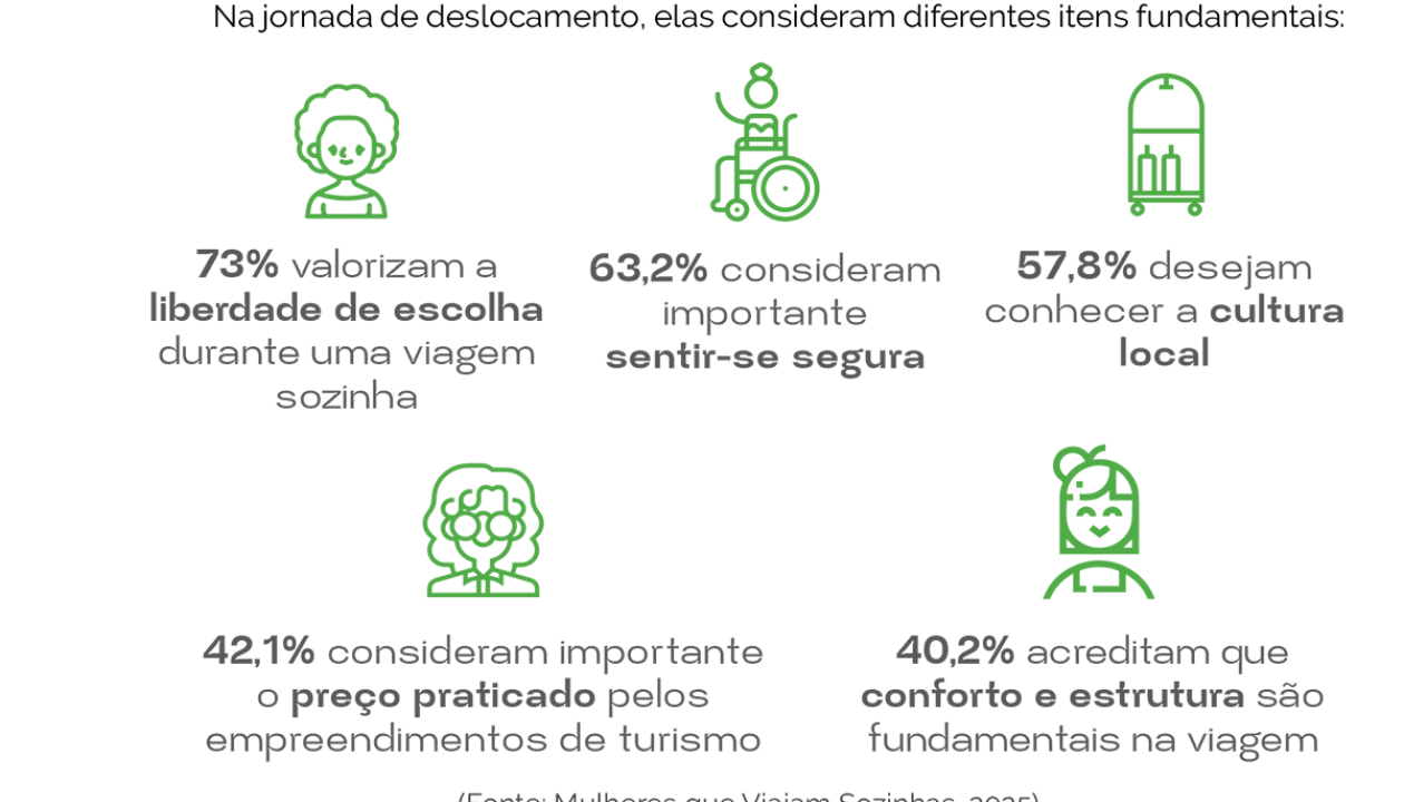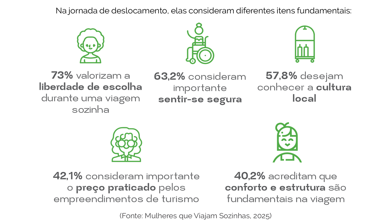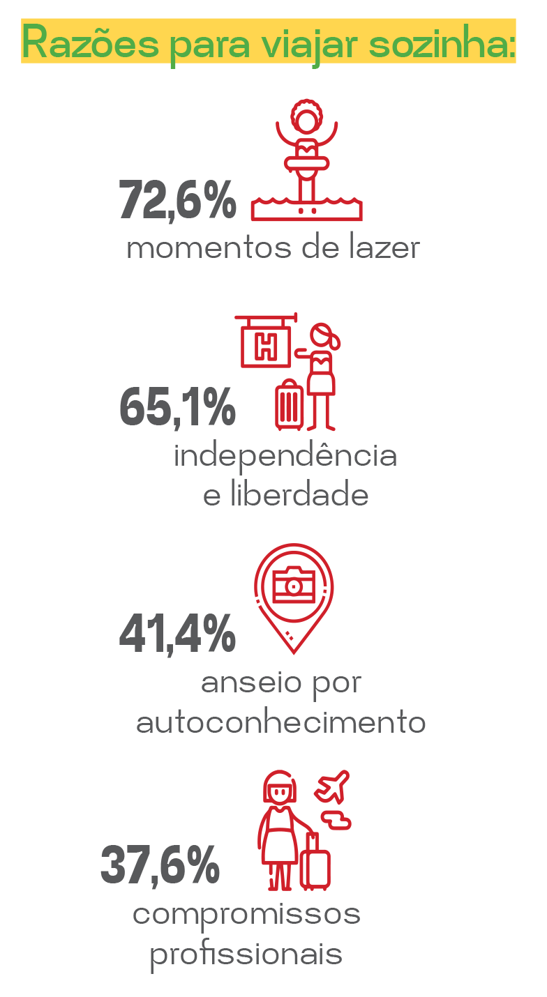 Os números da pesquisa revelam que os principais fatores que as levam a viajar sem companhia são: a busca por momentos de lazer (72,6%), o desejo por independência e liberdade (65,1%), o anseio por autoconhecimento (41,4%) e compromissos profissionais (37,6%).