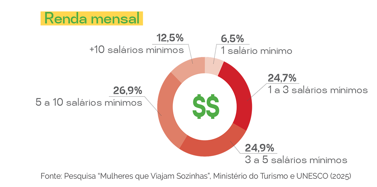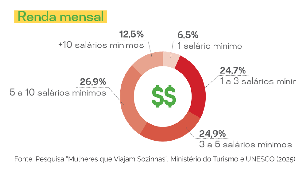 Outro fator relevante é que a maioria das mulheres que viajam sozinhas (67,7%) não tem filhos. Entre as respondentes, 26,9% afirmam ter renda de 5 a 10 salários mínimos; 24,9% situam-se na faixa de 3 a 5 salários mínimos; e 24,7% entre 1 e 3 salários mínimos. Além disso, 12,5% das respondentes informam renda superior a 10 salários mínimos.
