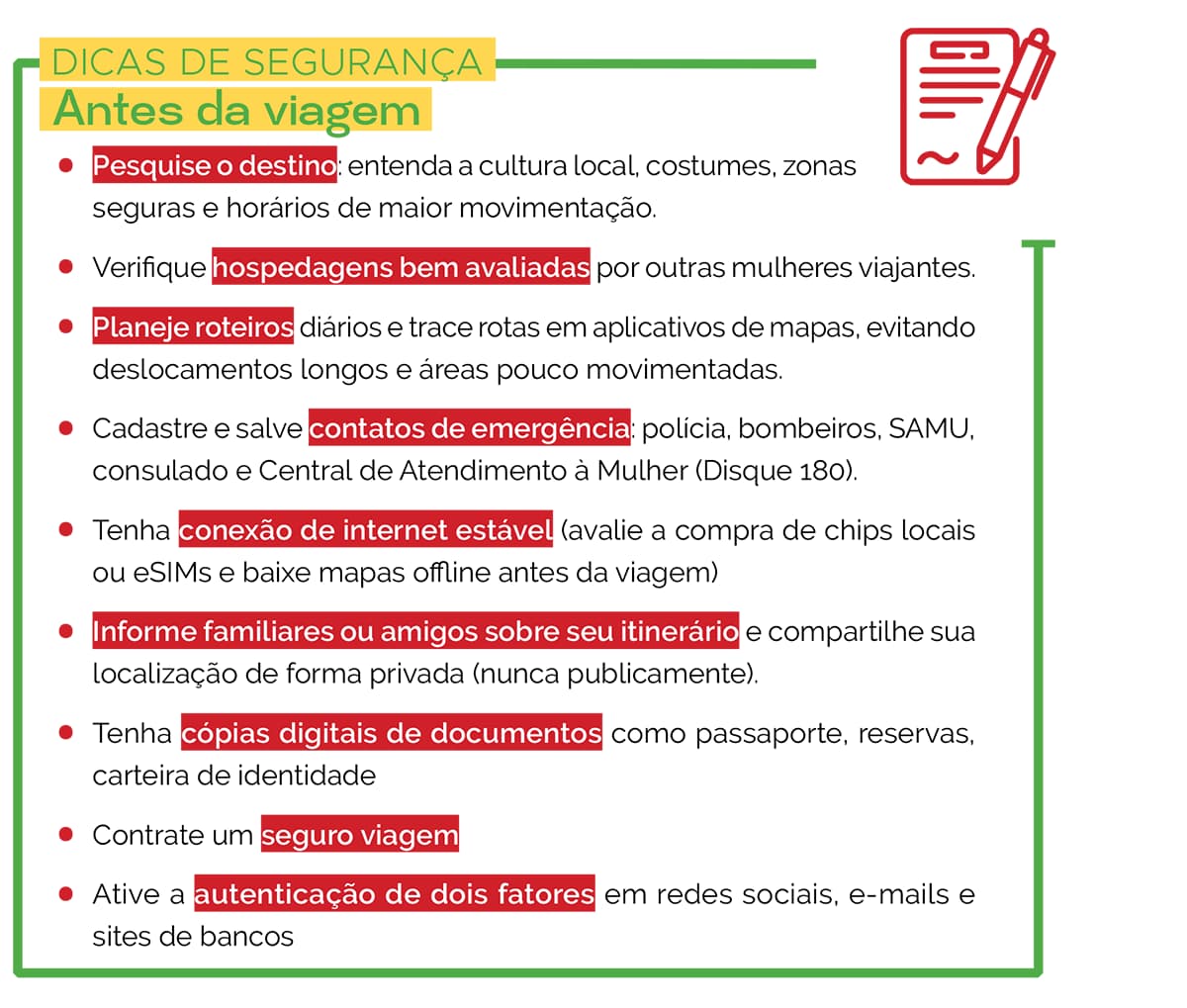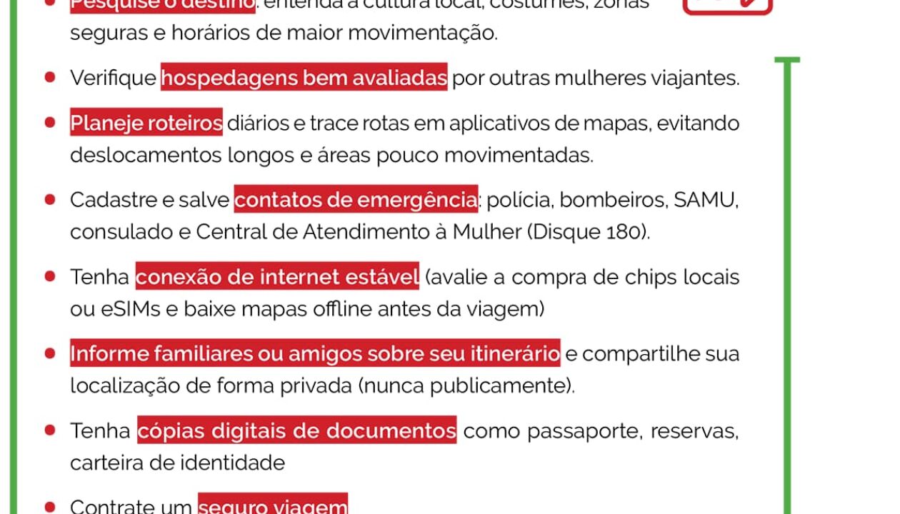 Em sintonia com a questão, o Ministério do Turismo lançou o ‘Guia para mulheres que viajam sozinhas’. Além dos dados, úteis para gestores públicos, operadores turísticos e para toda sorte de empresa que atenda viajantes, a publicação contém orientações para promover um turismo mais seguro, inclusivo, acolhedor e responsável.