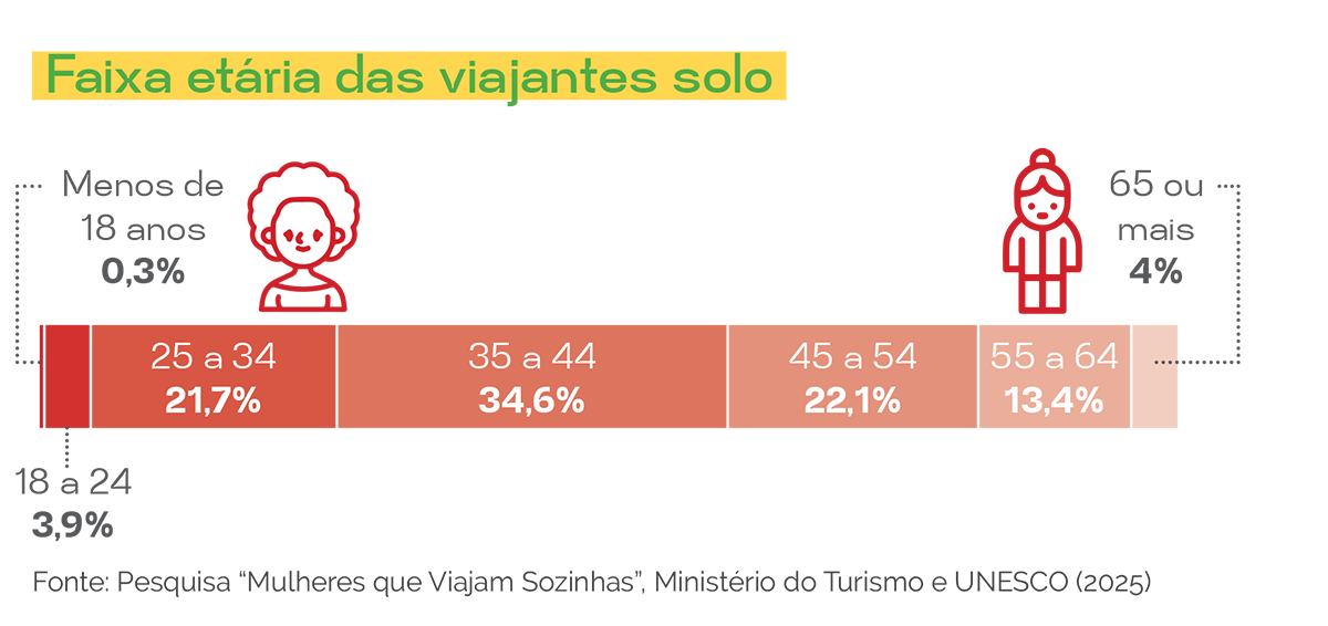 No Brasil, a pesquisa do Ministério do Turismo constatou que 40% das mulheres já viajaram sozinhas algumas vezes e 31,4% viajam sozinhas com alguma frequência (Freepik)No Brasil, a pesquisa do Ministério do Turismo constatou que 40% das mulheres já viajaram sozinhas algumas vezes e 31,4% viajam sozinhas com alguma frequência. A maioria delas (34,6%) tem entre 35 e 44 anos. Também formam grupos relevantes aquelas com idades entre 45 a 54 anos (22,1%), 25 a 34 anos (21,7%) e 55 a 64 anos (13,4%).