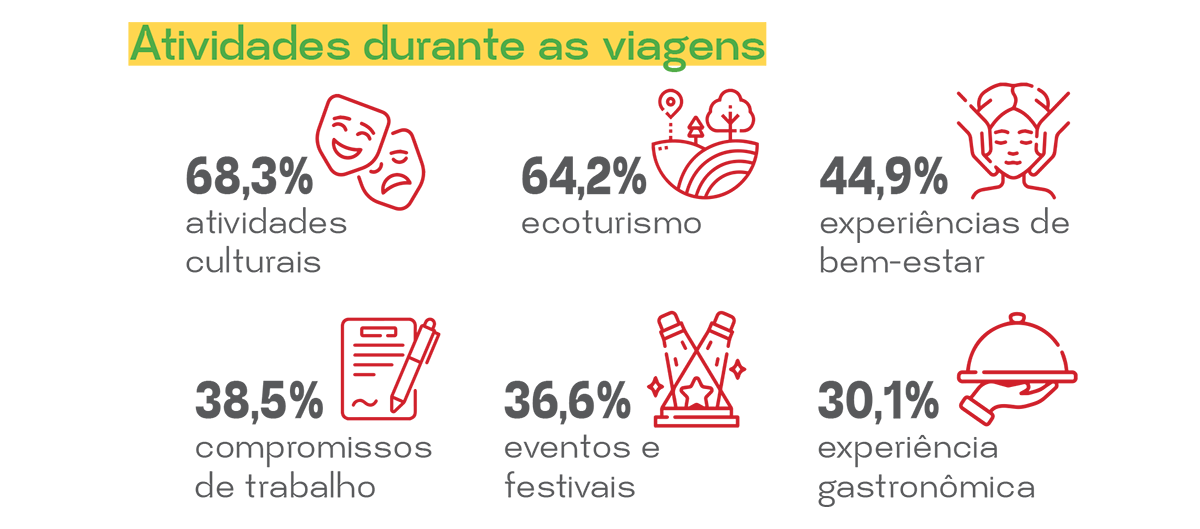 Fonte: ‘Guia para mulheres que viajam sozinhas’Experiências culturais e contato com a natureza são as principais atividades buscadas pelas mulheres que viajam sozinhas. Entre as respondentes, 68,3% afirmam estar interessadas em atividades culturais, como visitas a museus, centros históricos, entre outros. O ecoturismo aparece em seguida, com 64,2% de preferência, seguido por experiências de bem-estar (44,9%), compromissos de trabalho (38,5%), participação em eventos e festivais (36,6%) e interesse pela gastronomia (30,1%).