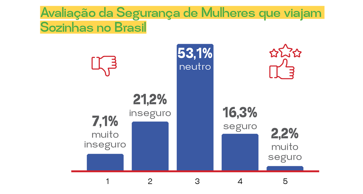 Sobre a segurança, o resultado mostra que mais da metade das entrevistadas (53,1%) adota uma percepção neutra, atribuindo nota 3 (de 1 a 5), o que indica que a experiência não é vista como totalmente segura nem totalmente perigosa, mas como um terreno que exige planejamento cuidadoso e vigilância. Quando se olha para os extremos, no entanto, a balança pende para a preocupação: 28,3% das respondentes sentem-se inseguras (notas 1 e 2), enquanto apenas 18,5% consideram o Brasil seguro (notas 4 e 5). Ou seja, quando as respostas fogem da neutralidade, a tendência majoritária é de preocupação.
