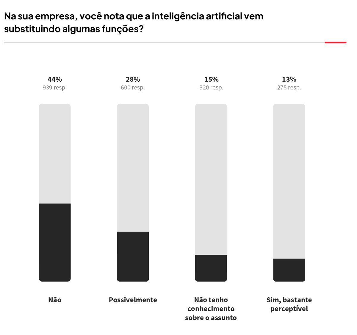 Para 28%, é provável que a empresa esteja utilizando a Inteligência Artificial como substituição para algumas funções (26% em 2024).