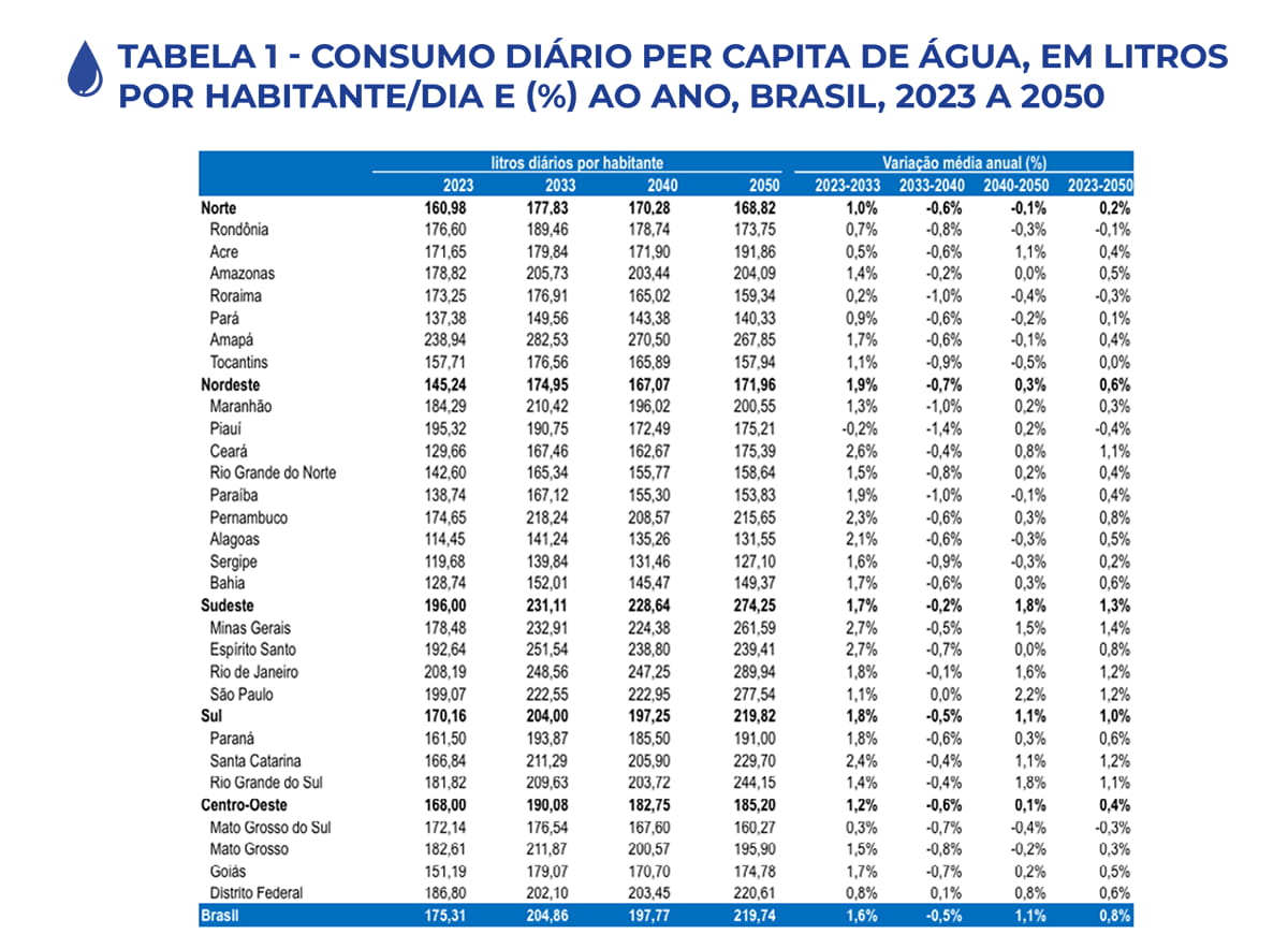 Nessa projeção, o consumo per capita médio do país deve passar de 175,29 litros diários por habitante em 2023 – com acesso ao sistema de abastecimento de água – para um volume médio de 204,86 litros diários por habitante em 2033. Isso corresponde a uma taxa média de crescimento anual de 1,6%, inferior ao aumento projetado para o rendimento per capita do trabalho no mesmo período, de 2,6% ao ano.