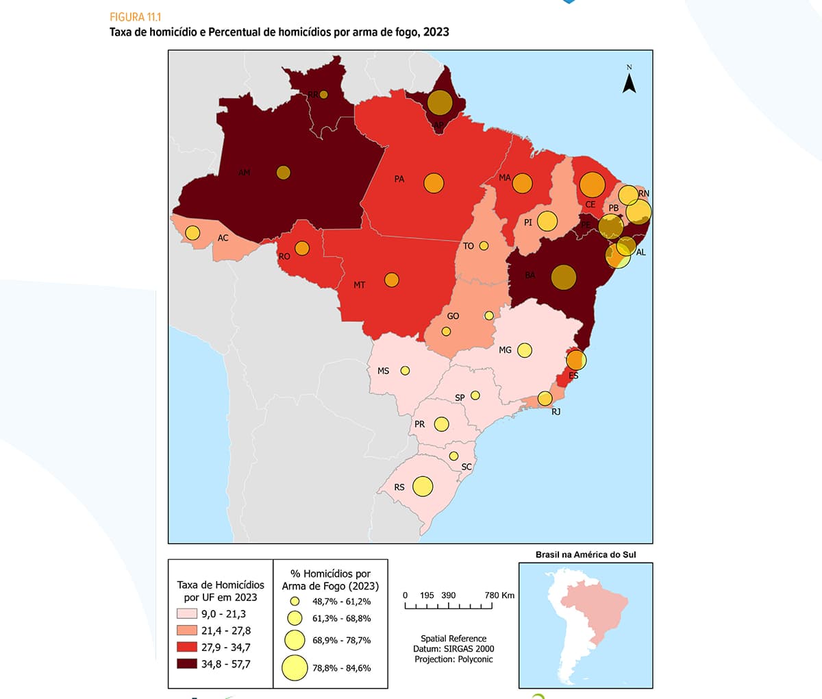 O Atlas da Violência também apresenta os dados por unidades da federação (UF). Em 2023, 20 estados apresentaram taxa de homicídio por 100 mil habitantes superior à média nacional, com destaque negativo para Amapá (57,4), Bahia (43,9) e Pernambuco (38).