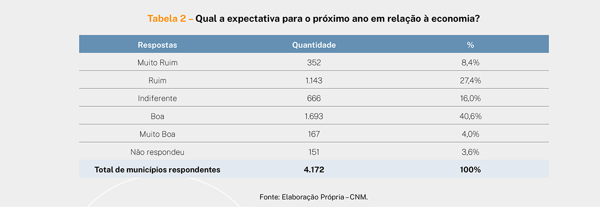 A CNM também sondou as expectativas dos gestores municipais para 2026. Os resultados mostram uma cisão, com viés otimista: 44,6% dos respondentes consideram as perspectivas boas ou muito boas, enquanto 35,8% se mostraram pessimistas. Outros 16% dos gestores não possuem prognósticos bons ou ruins para o desempenho econômico em 2026.