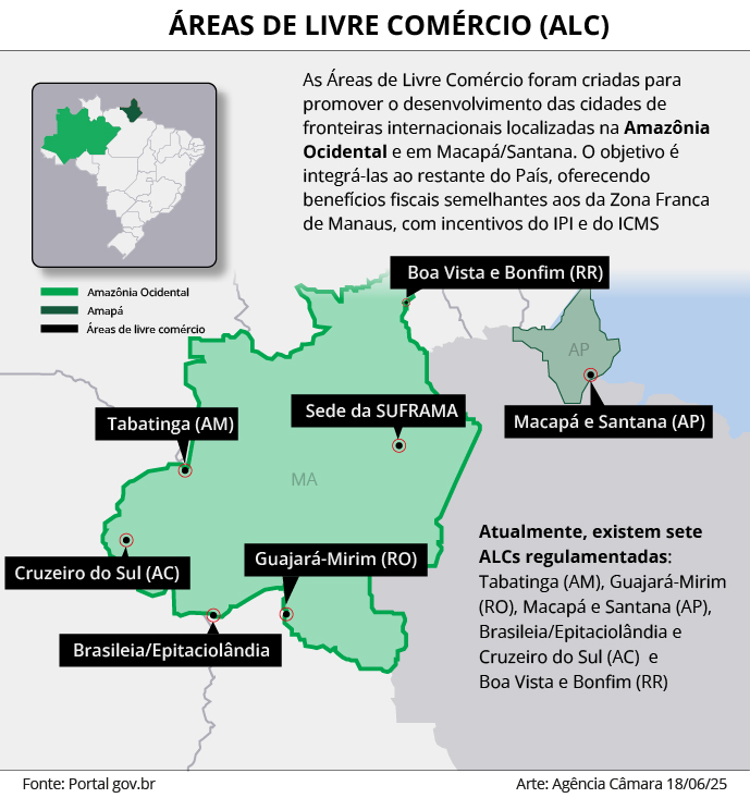 Imagem de satélite da América do Sul indicando a localização de cada Área de Livre Comércio (Suframa)Segundo a Superintendência da Zona Franca de Manaus (Suframa), ao todo o Brasil conta com cinco Áreas de Livre Comércio (ALC), todas localizadas na Amazônia, criadas para promover o desenvolvimento das cidades de fronteiras internacionais, com o intuito de integrá-las ao restante do país, oferecendo benefícios fiscais semelhantes aos da Zona Franca de Manaus no aspecto comercial, como incentivos do Imposto sobre Produtos Industrializados (IPI) e do Imposto sobre Circulação de Mercadorias e Prestação de Serviços (ICMS).
