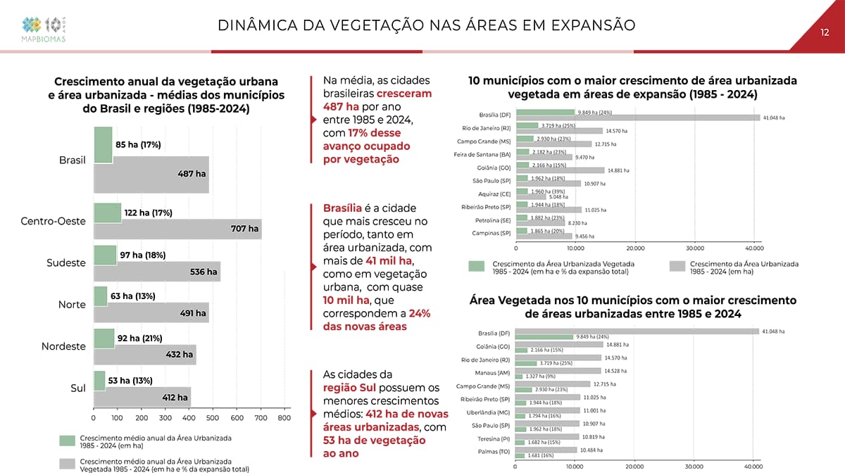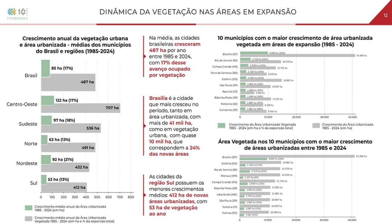 O aumento na área total vegetada em regiões urbanizadas no Brasil ocorreu na área urbana que se expandiu entre 1985 e 2024. A expansão das cidades nesse período incorporou 475 mil hectares de vegetação, superando a perda de 13 mil hectares nas áreas consolidadas em 1985 e resultando em um saldo positivo de 462 mil hectares. Brasília, Rio de Janeiro e São João (PE) foram as cidades que mais ganharam áreas urbanas vegetadas nas últimas quatro décadas.