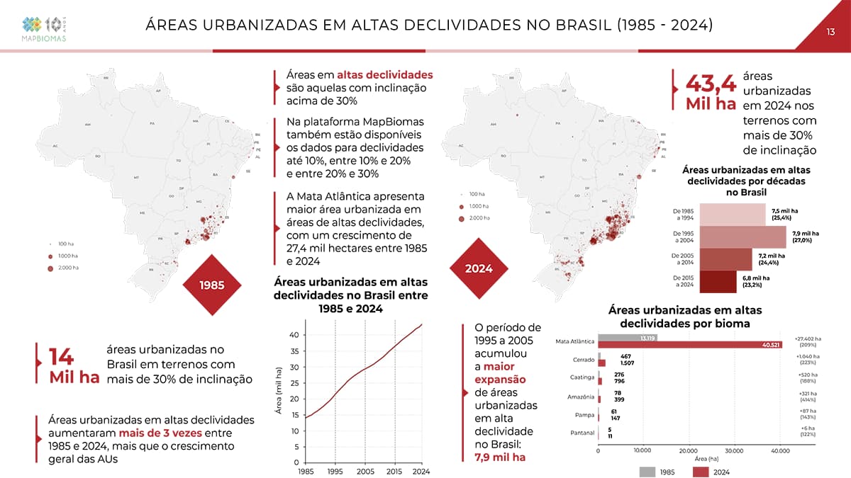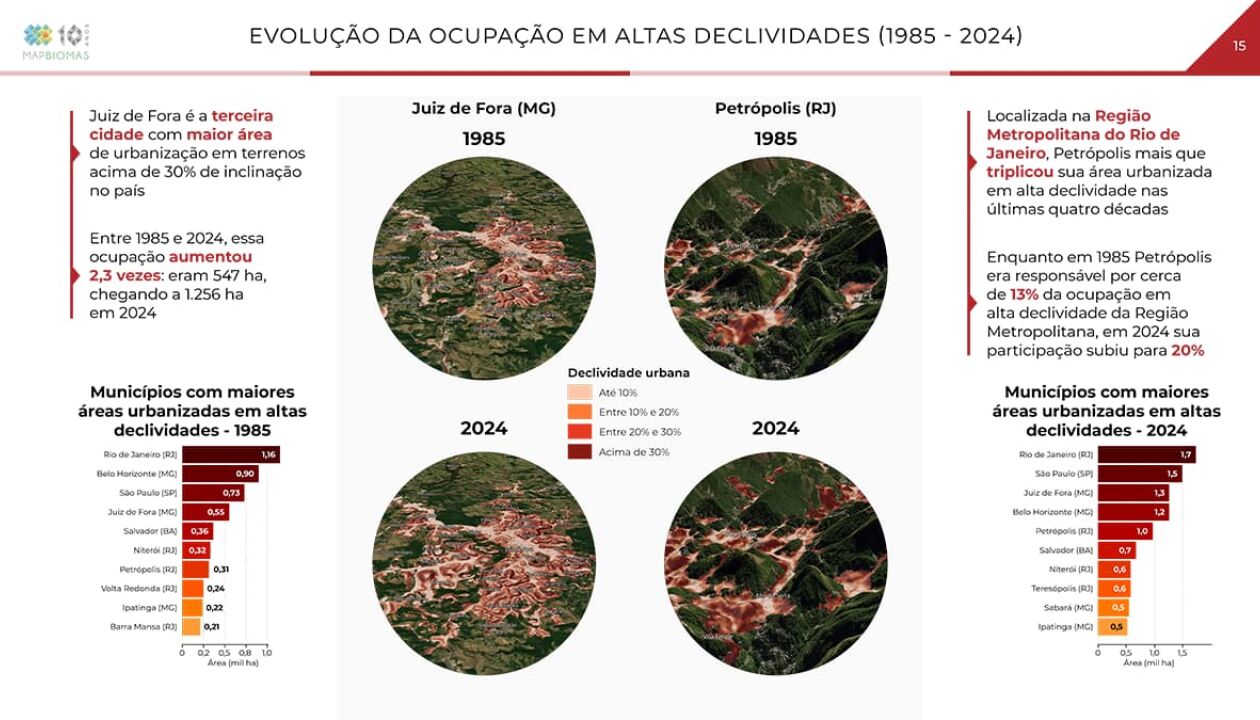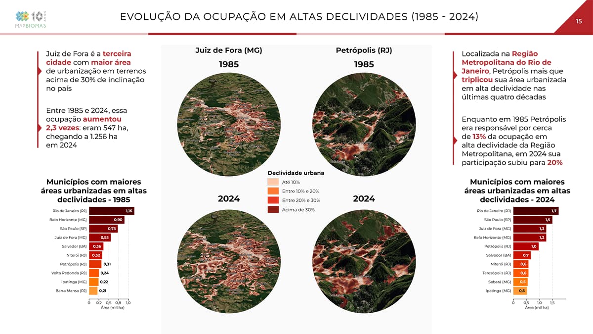 Em 1985, os municípios com mais áreas urbanizadas em regiões de alta declividade eram Rio de Janeiro (1,16 mil hectares), Belo Horizonte (900 hectares) e São Paulo (730 hectares). Em 2024, a liderança continua com o Rio de Janeiro (1,7 mil hectares), porém São Paulo assumiu a vice-liderança (1,5 mil hectares) e Juiz de Fora subiu para a terceira posição (1,3 mil hectares), à frente de Belo Horizonte (1,2 mil hectares).