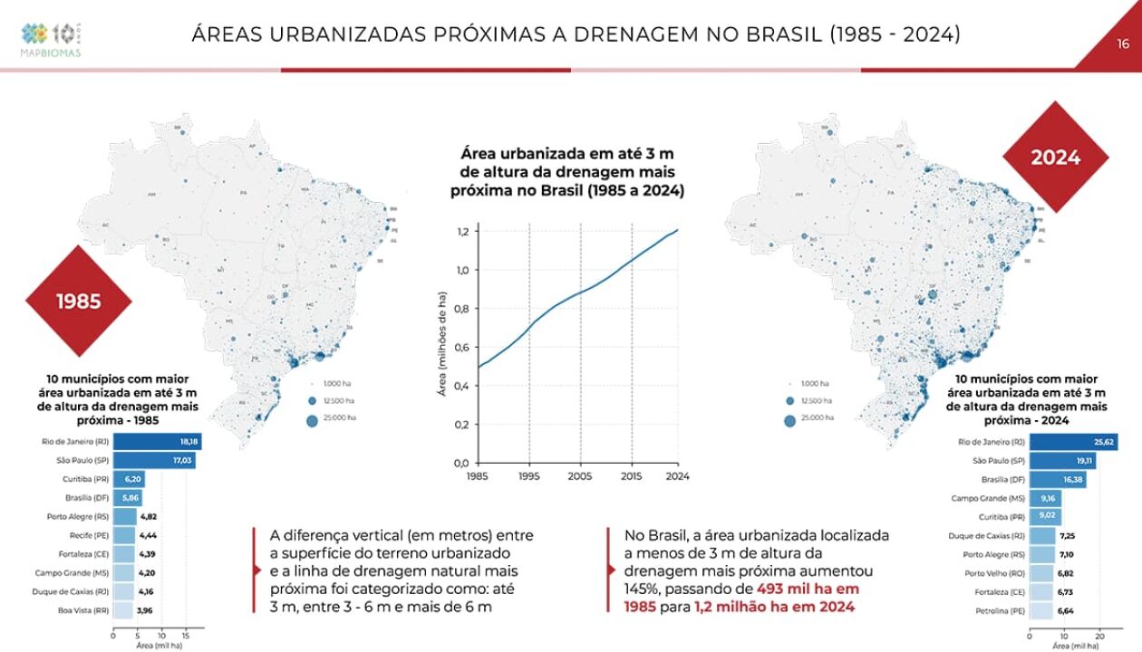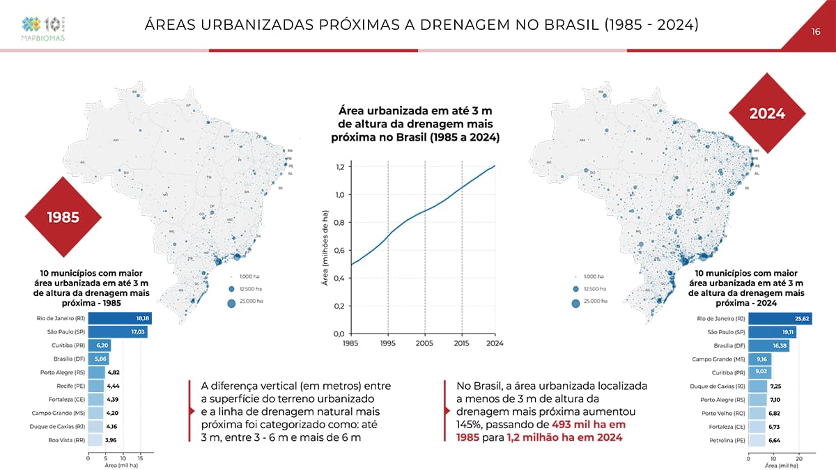Rio de Janeiro e São Paulo respondem pelo primeiro e segundo lugares no ranking dos municípios com maior área urbanizada com até três metros de altura da drenagem mais próxima, tanto em 1985 (18,18 mil hectares e 17,03 mil hectares, respectivamente) como em 2024 (25,62 mil hectares e 19,11 mil hectares). Em 1985, Curitiba ocupava o terceiro lugar, com 6,2 mil hectares; em 2024, essa posição foi ocupada por Brasília, com 16,38 mil hectares.