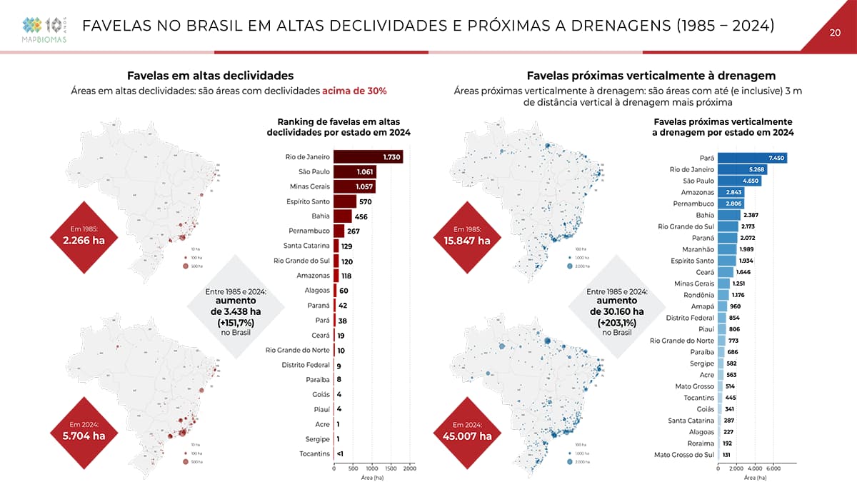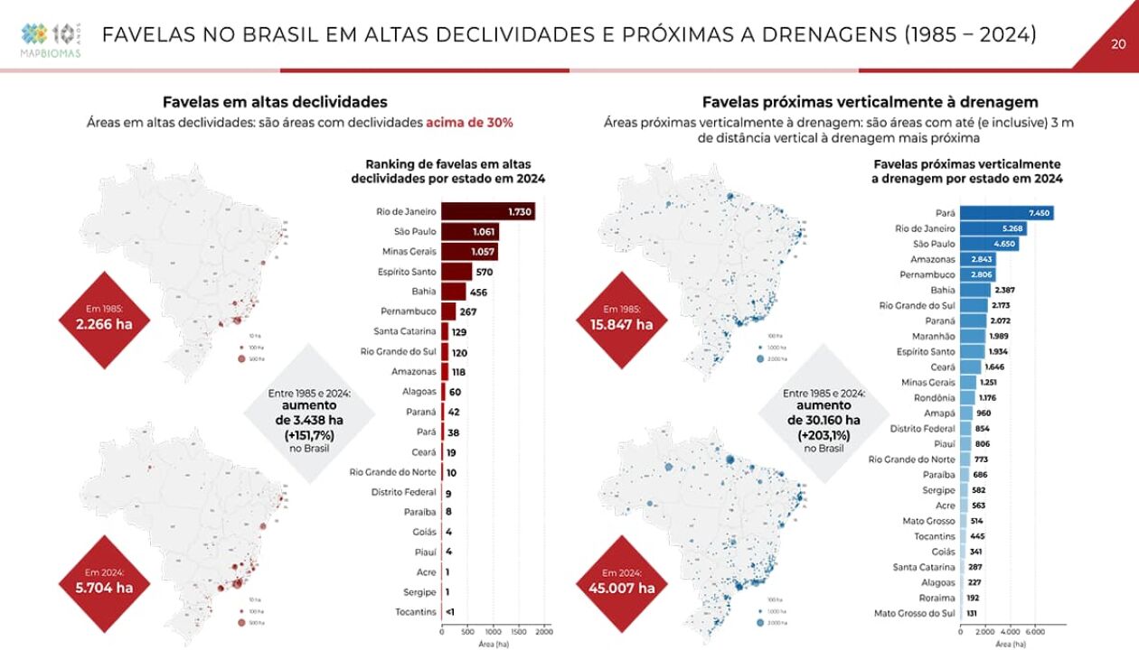 Também cresceu a área de favelas em áreas a menos de 3 metros de distância vertical de áreas de drenagem. O aumento foi de mais de 200% entre 1985 e 2024 (+30.160 hectares). Em 1985 eram 15.847 hectares; em 2024, 45 mil hectares. Pará (7.450 hectares), Rio de Janeiro (5.260 hectares) e São Paulo (4.650 hectares) lideram o ranking dos estados com maiores áreas nessa condição.