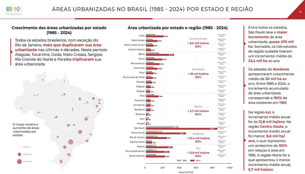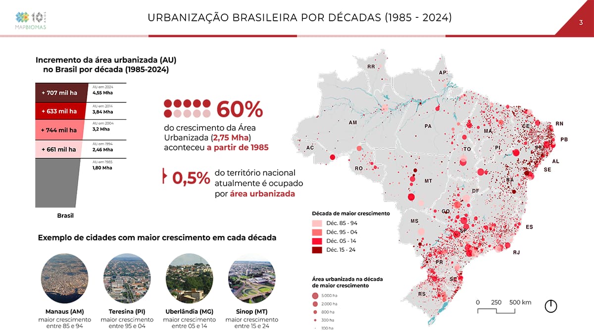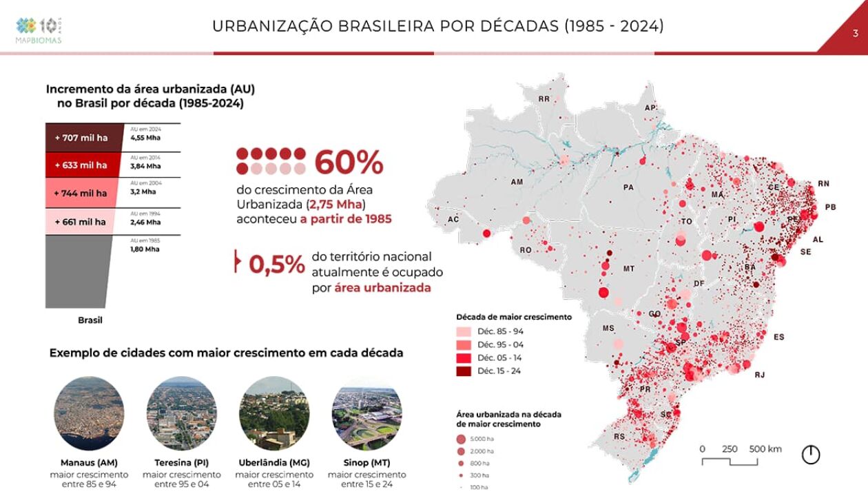 Fonte: Destaques do Mapeamento Anual de Cobertura e Uso da Terra - 1985 a 2024Nas últimas quatro décadas, as áreas urbanas no Brasil cresceram 2,5 vezes, passando de 1,8 milhão de hectares em 1985 para 4,5 milhões de hectares em 2024, ou 0,5% do território nacional – um aumento médio de cerca de 70 mil hectares ao ano. Já as áreas urbanizadas em altas declividades aumentaram mais de 3 vezes no mesmo período. Em 1985 eram 14 mil hectares; em 2024, 43,4 mil (crescimento de 210%).