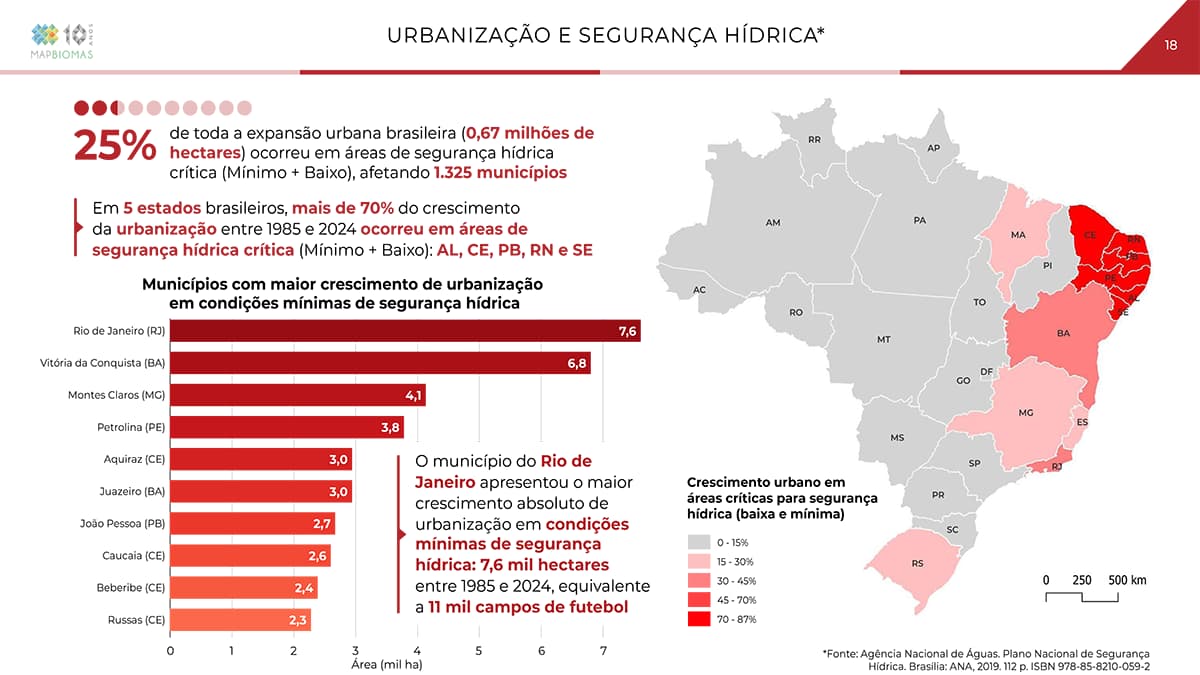 De toda a expansão urbana brasileira sobre áreas naturais (670 mil hectares), 25% ocorreram em áreas de segurança hídrica crítica (mínimo mais baixo), afetando 1.325 municípios. Em cinco estados brasileiros, mais de 70% do crescimento da urbanização entre 1985 e 2024 ocorreu em áreas de segurança hídrica crítica: Alagoas, Ceará, Paraíba, Rio Grande do Norte e Sergipe.