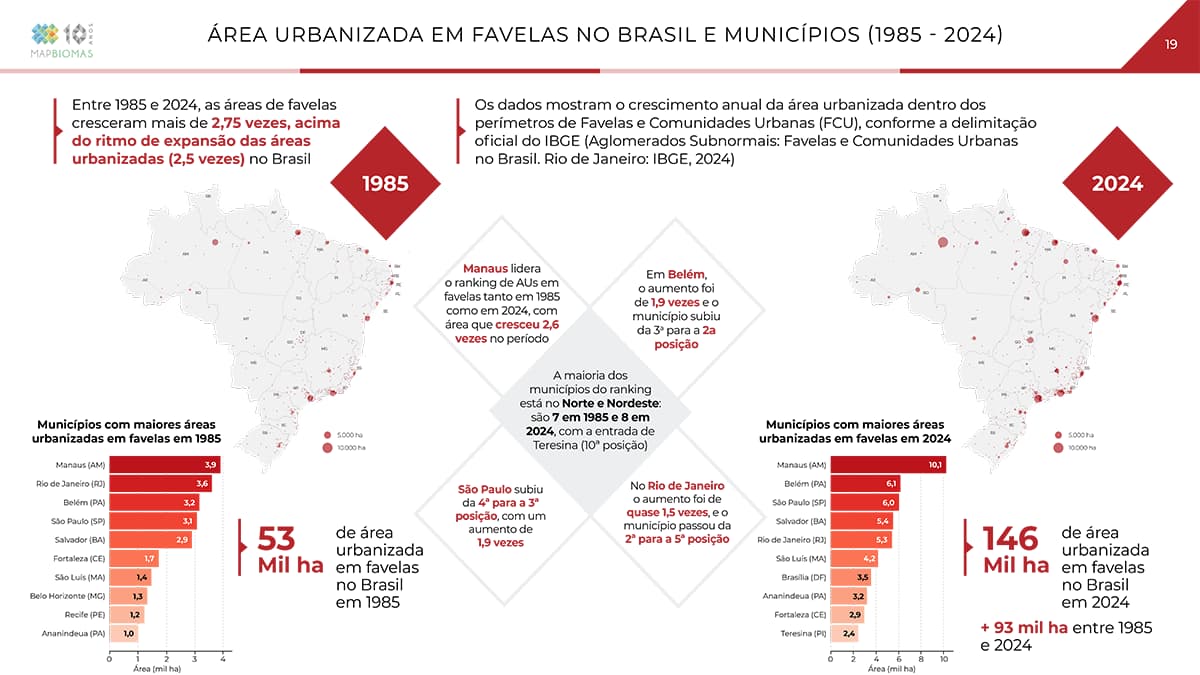 Manaus lidera o ranking de áreas urbanizadas em favelas tanto em 1985 como em 2024, com um crescimento de 2,6 vezes no período. Ela é uma das capitais da região Norte que, com as do Nordeste, ocupam o topo do ranking das 10 maiores áreas urbanizadas em favelas no Brasil: 7 em 1985 e 8 em 2024, com a entrada de Teresina (10ª posição). O Rio de Janeiro, que ocupava a vice-liderança em 1985, com 3,6 mil hectares, caiu para a quinta posição em 2024, com 5,3 mil hectares. Apesar disso, o aumento nesse município foi de quase 1,5 vez. São Paulo, por sua vez, subiu da quarta posição (3,1 mil hectares) para a terceira (6 mil hectares) – um aumento de 1,9 vezes.