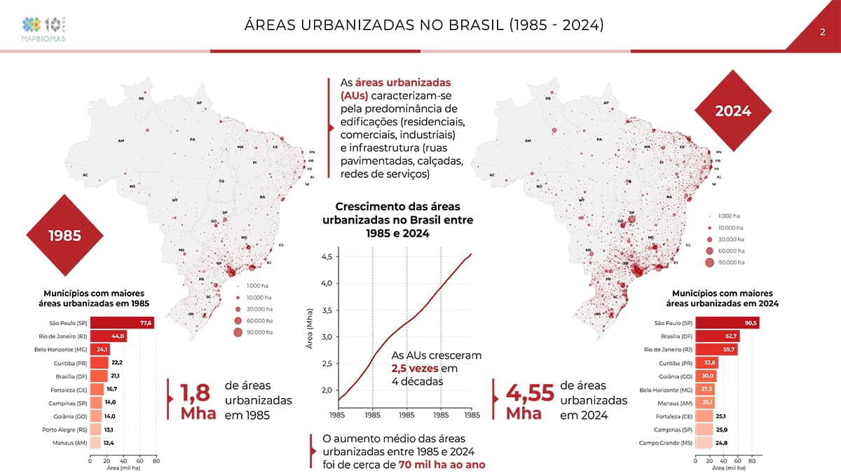Em 1985, os municípios com maior área urbanizada eram São Paulo (77,6 mil hectares), Rio de Janeiro (44 mil hectares) e Belo Horizonte (24,1 mil hectares). Em 2024, São Paulo manteve a liderança (90,5 mil hectares), porém Brasília saiu do quinto lugar ocupado em 1985 (21,1 mil hectares) para o segundo lugar (62,7 mil hectares) do ranking, seguida pelo Rio de Janeiro (59,7 mil hectares).