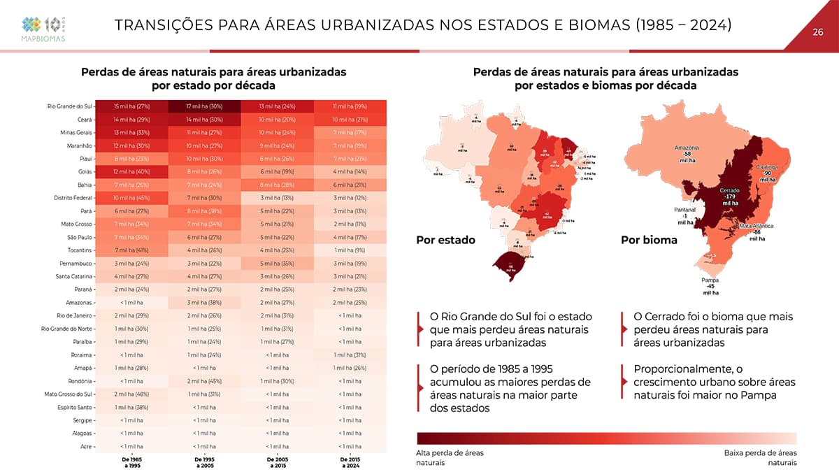 Mais de 680 mil hectares urbanizados em 2024 eram áreas naturais em 1985; outros 1,84 milhão de hectares já estavam antropizados, de uso agropecuário. O crescimento urbano sobre agropecuária foi 2,7 vezes maior do que o crescimento urbano sobre áreas naturais.