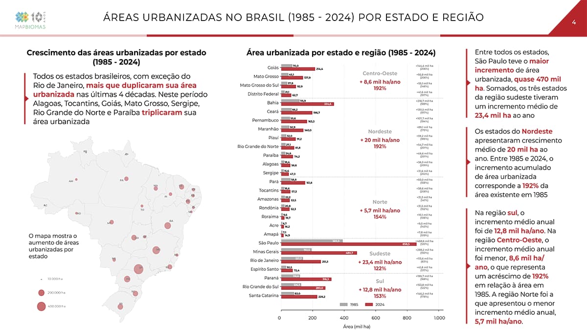 Todos os estados brasileiros, com exceção do Rio de Janeiro, mais que duplicaram sua área urbanizada nas últimas quatro décadas. Neste período, Alagoas, Tocantins, Goiás, Mato Grosso, Sergipe, Rio Grande do Norte e Paraíba triplicaram sua área urbanizada. São Paulo, por sua vez, foi o estado com maior incremento de área urbanizada: 470 mil hectares – área similar ao crescimento urbano observado em todo o bioma da Caatinga.