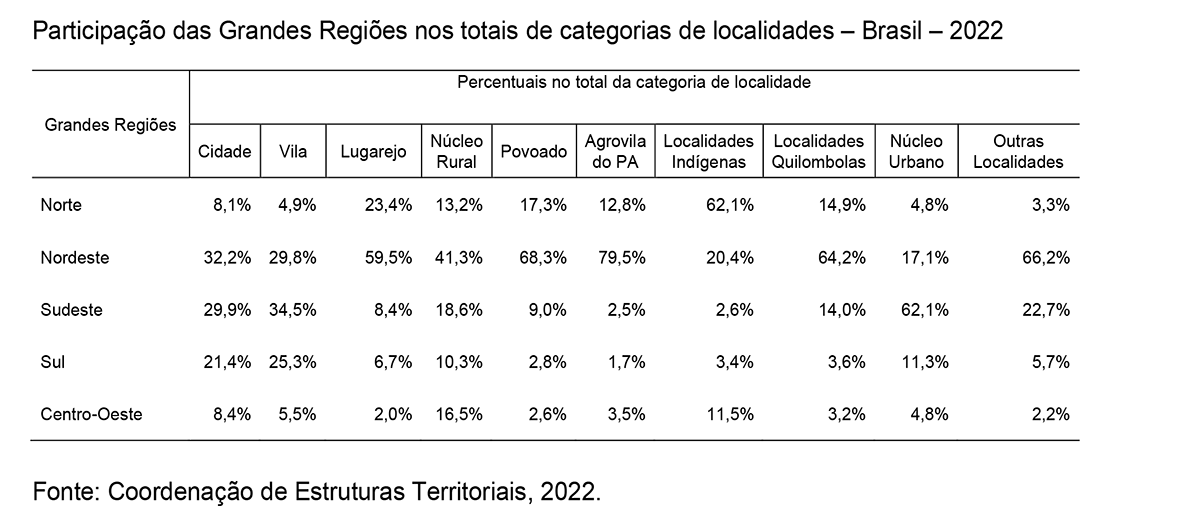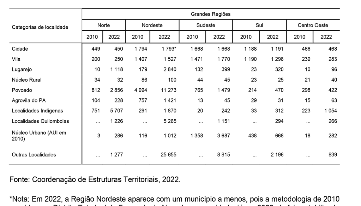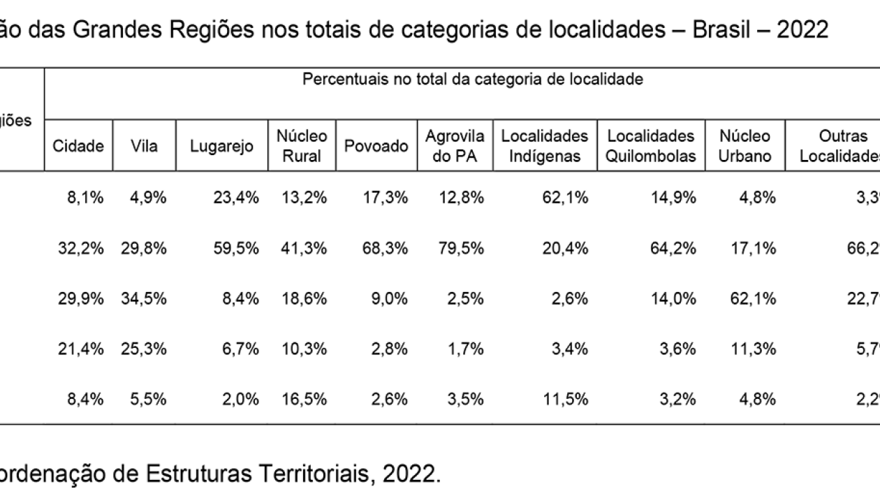 Segundo o instituto, os dados revelam diferenças marcantes entre as regiões do país, com o Sul e o Sudeste concentrando mais localidades em situação urbana, isto é, classificadas como cidades, vilas ou núcleos urbanos. “Por outro lado, Norte e Nordeste concentram os maiores números absolutos de povoados e lugarejos, fortalecendo a imagem de um Brasil em que o mundo rural ainda é muito presente e diversificado”, explica o relatório.