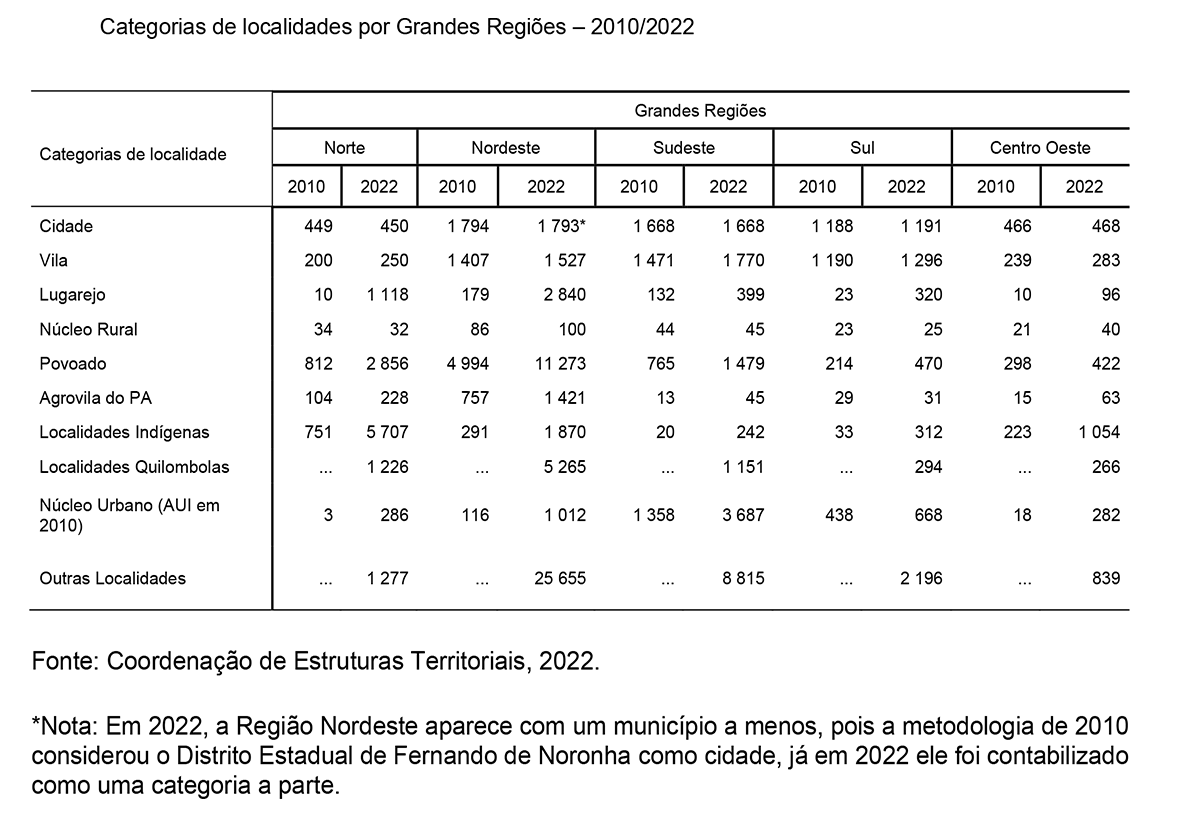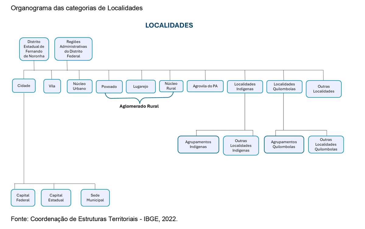O mapeamento das localidades é uma das atividades mais antigas e importantes do IBGE, indispensável para a realização de censos e pesquisas estatísticas. No estudo atualizado pelos dados do Censo 2022, destacam-se as seguintes categorias: