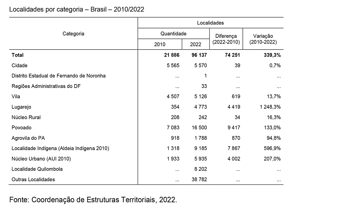No censo anterior, de 2010, o país contava com 21.886 localidades, o que representa uma expansão de 65.476 novas aglomerações de habitantes (+339,3%). O IBGE afirmou que a multiplicação desses aglomerados é explicada por questões técnicas, como a utilização de imagens de satélite de alta resolução espacial.