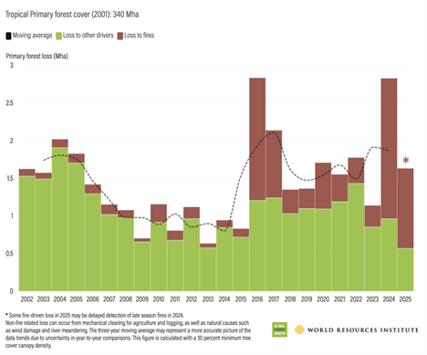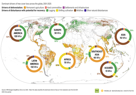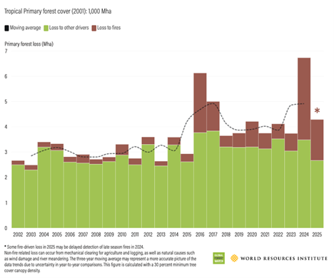 Globalmente, os incêndios foram os grandes causadores da perda arbórea em 2025. Nos últimos três anos, os incêndios causaram o dobro da perda de florestas do que duas décadas atrás.