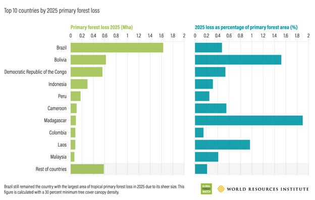 Alguns países dominaram a perda de floresta primária tropical em 2025 em termos de área, mas a distribuição percentual é diferenteFonte: Global Forest Watch