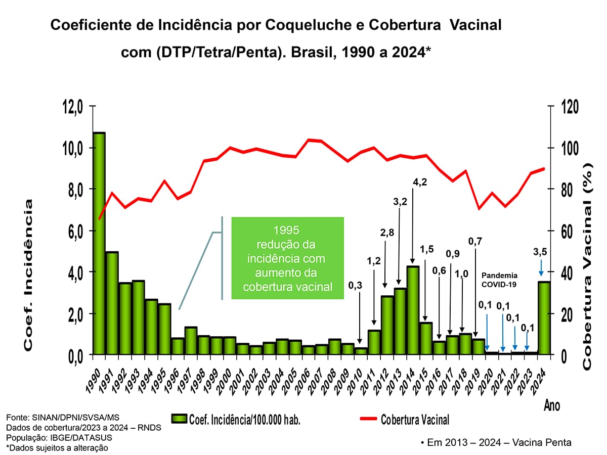 Segundo os pesquisadores, o aumento dos casos contrasta com o avanço gradual da cobertura vacinal da DTP (Tríplice Bacteriana Infantil – Difteria, Tétano e Coqueluche) em menores de um ano. A cobertura passou de 87,6%, em 2023, para 90,2%, em 2024. Porém, apesar do leve aumento, o índice ainda não alcançou a meta nacional de 95% definida pelo Programa Nacional de Imunizações (PNI).
