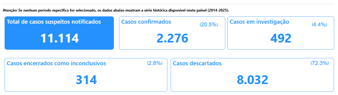 Até o mês de agosto de 2025, já foram 1.148 casos notificados de coqueluche em crianças menores de cinco anos. Os estados com maior concentração neste ano são Minas Gerais (229), São Paulo (217) e Rio Grande do Sul (146). Os estados de Rondônia, Acre e Espírito Santo não tiveram registros.
