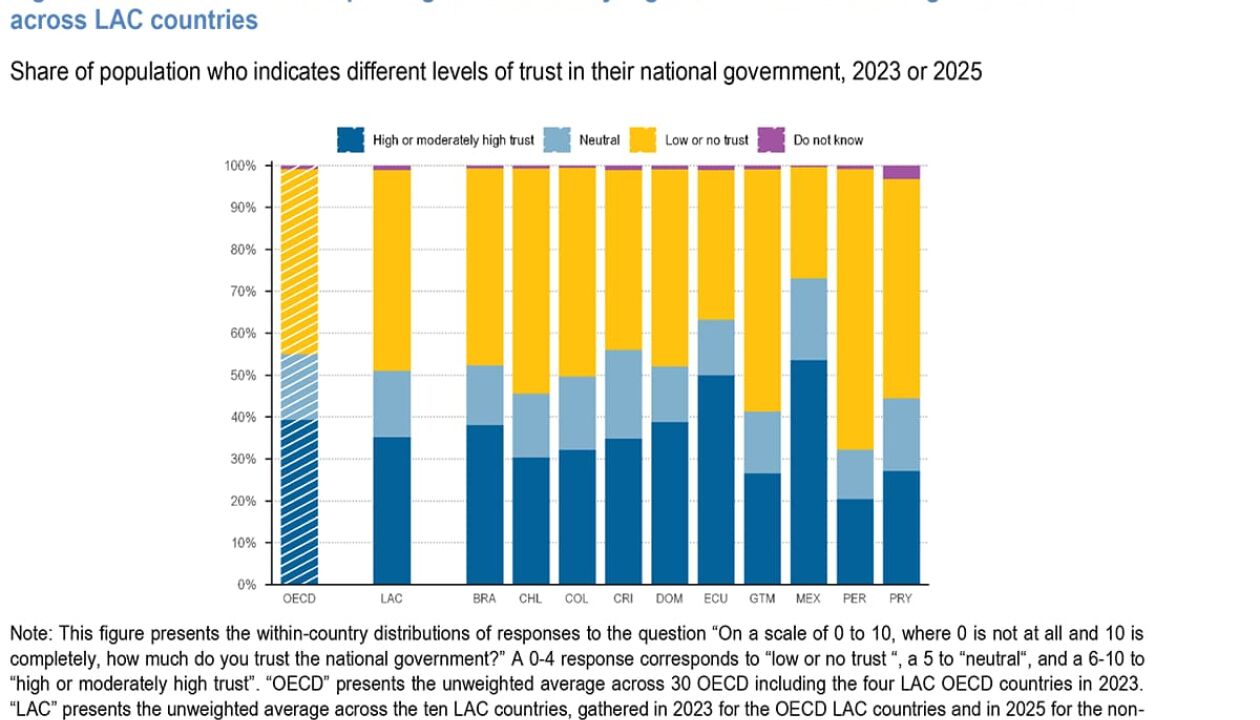 Fonte: OECD Survey on Drivers of Trust in Public Institutions in Latin America and the CaribbeanO ministro da Controladoria-Geral da União, Vinicius Marques de Carvalho, apontou que a recuperação revelada no levantamento é fundamental, em especial para nações que passaram por recentes ataques ao regime democrático, como o Brasil.