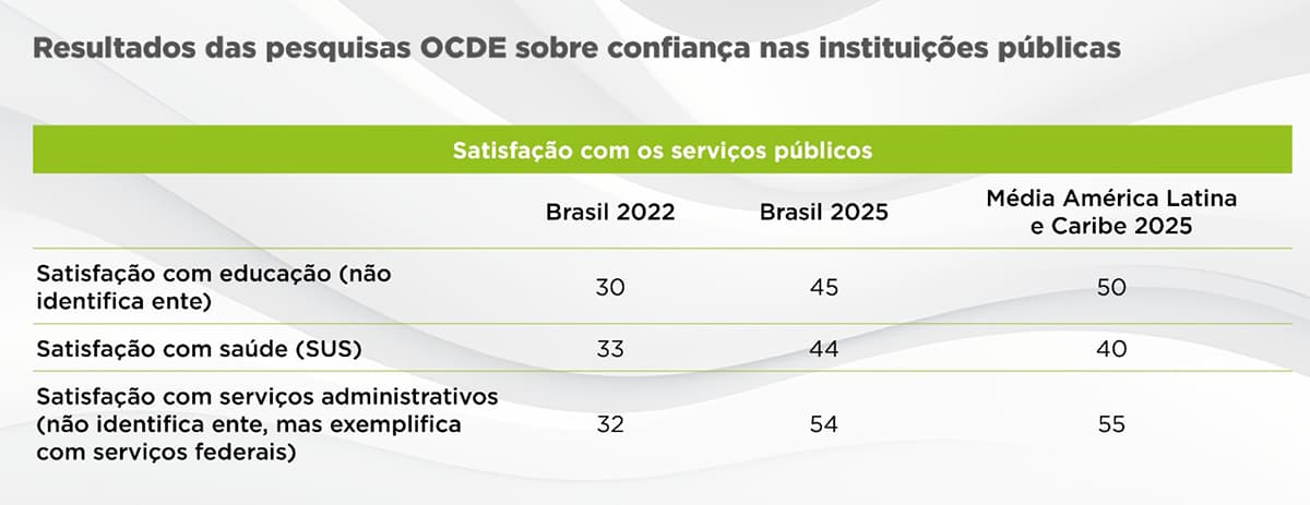 O estudo ‘OECD Survey on Drivers of Trust in Public Institutions in Latin America and the Caribbean’ - Confiança em Instituições Públicas na América Latina e no Caribe, divulgado pela Organização para a Cooperação e Desenvolvimento Econômico (OCDE), mostrou que a confiança dos brasileiros no serviço público aumentou 18 pontos percentuais em três anos, passando de 24% em 2022 para 42% em 2025. Na América Latina e no Caribe, a média ficou em 32% no período.