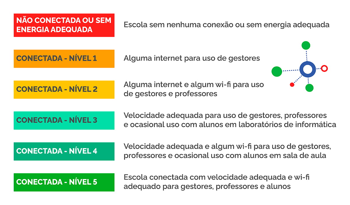 O Indicador Escolas Conectadas possui parâmetros exigentes, considerando três desafios para que a internet seja efetivamente usada em sala de aula: energia elétrica estável, velocidade mínima de 1 Mbps por estudante no maior turno escolar e rede Wi-Fi com cobertura nos espaços pedagógicos. Com base nesses parâmetros, o indicador classifica as escolas de 0 a 5, e a Enec considera como conexão adequada para uso pedagógico os níveis 4 e 5:
