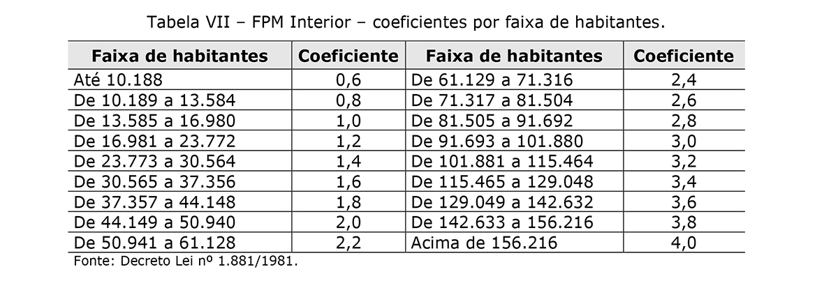 Isso porque o Decreto-Lei n.º 1.881 (27/08/1981) estabeleceu os coeficientes do FPM baseados por faixa de habitantes. Desta forma, as cidades com até 10.188 habitantes ficam igualmente com uma cota de 0,6% do fundo; aquelas de 10.189 até 13.584, com 0,8%, e daí por diante.