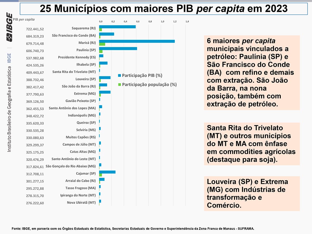 Em 2023, os dez municípios brasileiros com maiores PIB per capita concentraram apenas 0,3% da população, mas responderam por 3,4% do PIB nacional. Saquarema (RJ) liderou o ranking, com R$ 722,4 mil por habitante, impulsionada pela extração de petróleo e gás, atividade que também sustentou o desempenho de Maricá (RJ), Presidente Kennedy (ES), Ilhabela (SP) e São João da Barra (RJ). A média nacional foi de R$ 53,9 mil.
