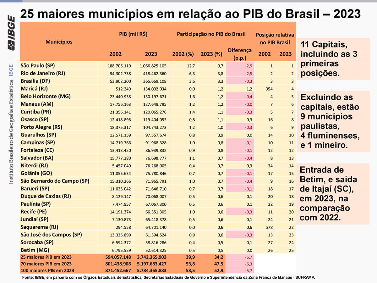 A publicação ‘PIB dos Municípios 2022-2023’, divulgada pelo Instituto Brasileiro de Geografia e Estatística (IBGE), revela que São Paulo/SP (9,7%), Rio de Janeiro/RJ (3,8%), Brasília/DF (3,3%), Maricá/RJ (1,2%), Belo Horizonte/MG (1,2%), Manaus/AM (1,2%), Curitiba/PR (1,1%), Osasco/SP (1,1%), Porto Alegre/RS (1,0%) e Guarulhos/SP (0,9%) respondem por 24,5% do Produto Interno Bruto (PIB), que é soma de bens e serviços produzidos no Brasil, no ano de 2023. Em termos de comparação, em 2002, apenas São Paulo, Rio de Janeiro, Brasília e Belo Horizonte representavam essa mesma proporção do PIB.