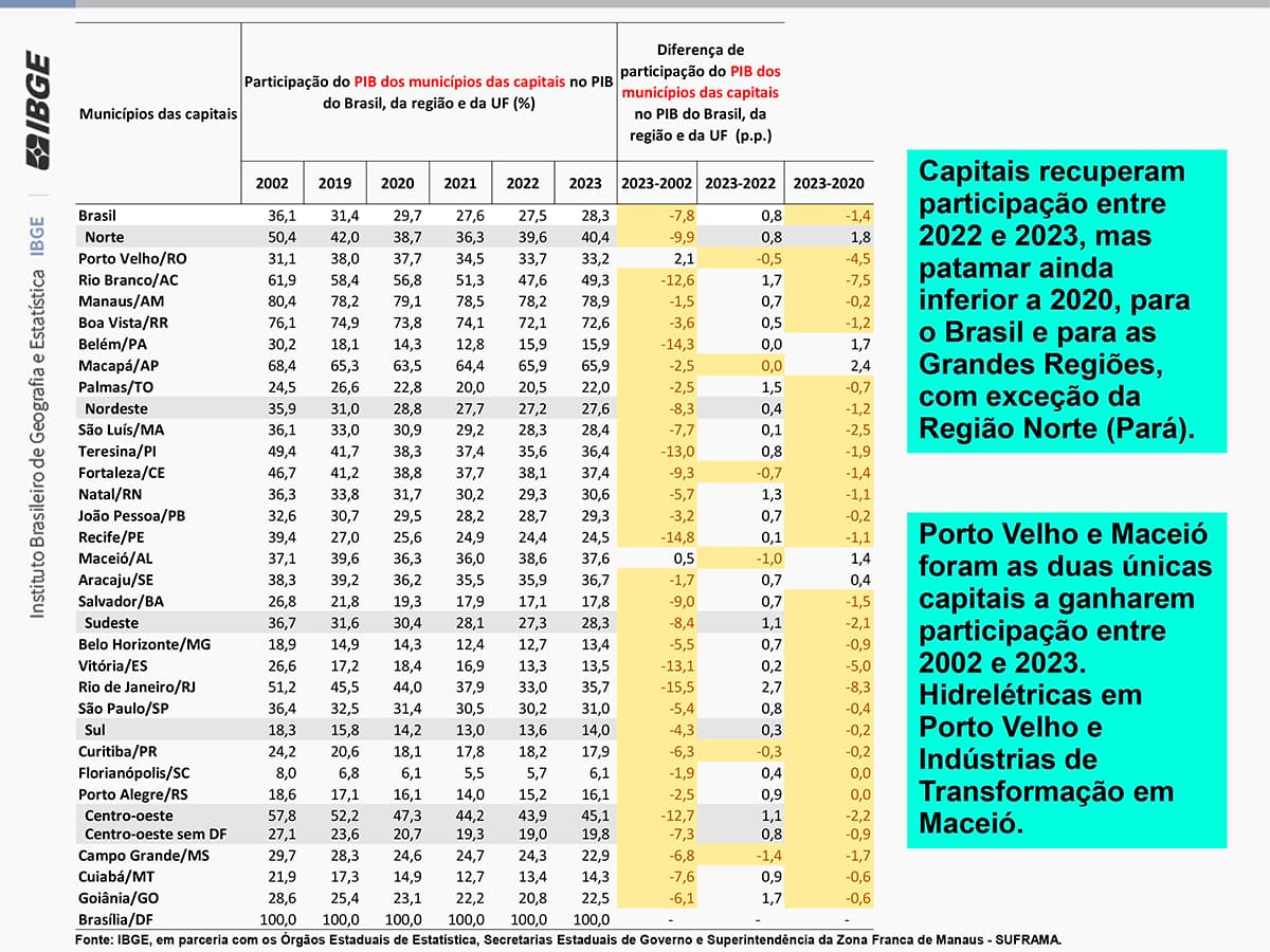 Esse resultado contribuiu para a desaceleração da desconcentração econômica do país. A participação no PIB nacional dos 5.543 municípios que não são capitais recuou de 72,5% em 2022 para 71,7% em 2023, enquanto os 27 municípios de capital expandiram de 27,5% para 28,3%. O ano de 2022 marcou a menor participação das capitais. Em 2002, início da série histórica, esses indicadores eram de 36,1% para capitais e 63,9% para os demais municípios do país.