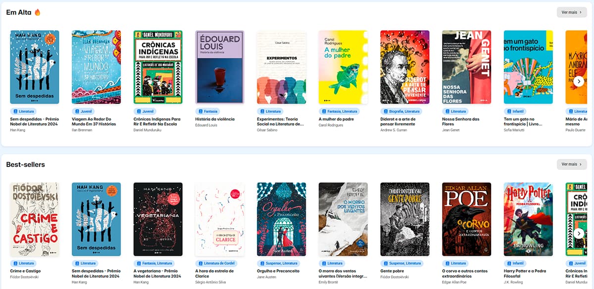 O app conta com obras literárias nacionais e internacionais. São 1,2 mil lançamentos e best-sellers, que poderão alcançar 224 mil empréstimos anuais e 18.600 mensais. Também são ofertados 3.600 títulos (backlist/longsellers), que podem ser lidos por 1,4 milhão de pessoas anualmente, além de mil obras com empréstimos ilimitados.