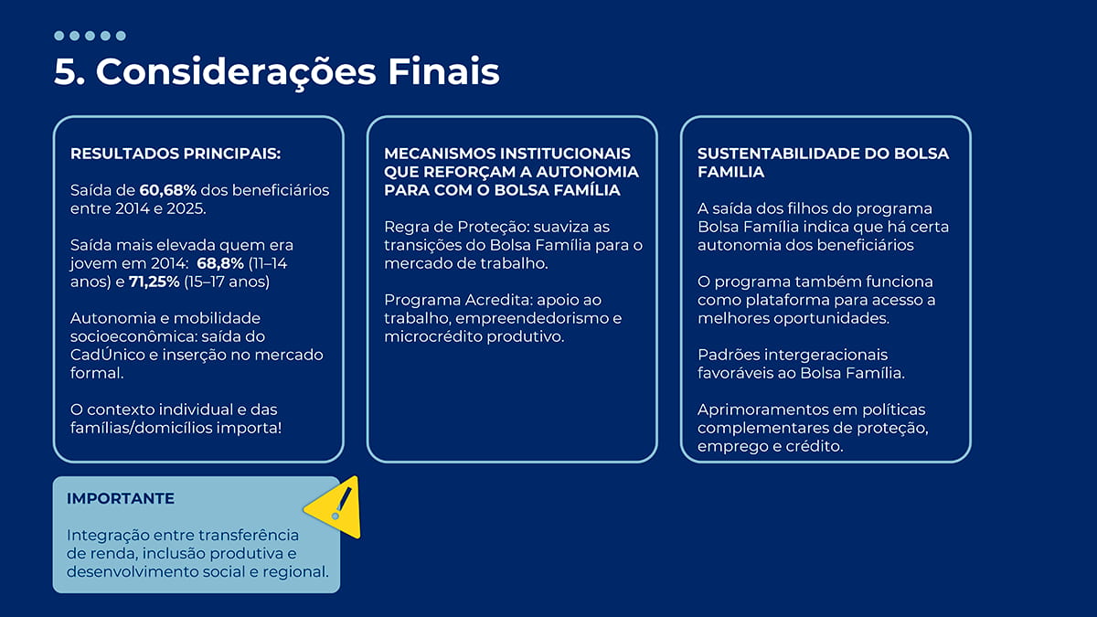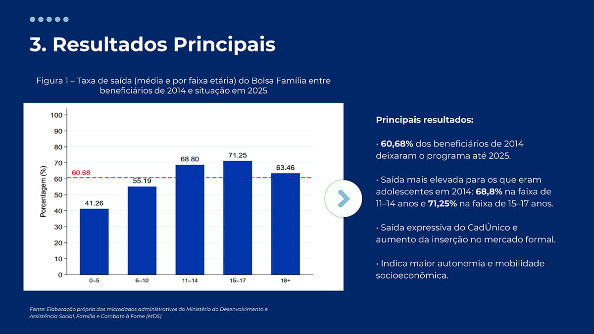 A pesquisa concluiu que o ambiente socioeconômico no qual estão inseridos os beneficiários do Bolsa Família influenciou a taxa de saída do programa no período de 2014 a 2025.