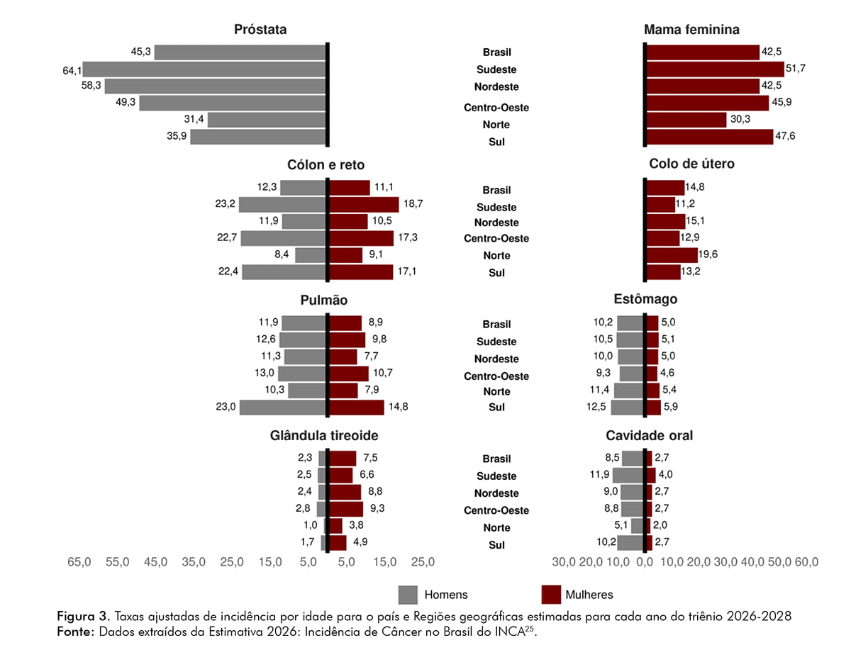 De acordo com o estudo, a incidência de câncer no Brasil apresenta variações regionais, conforme observado nas taxas estimadas e nos tipos mais incidentes nas diferentes regiões e unidades federativas (UF). Entre os homens, o câncer de próstata mantém-se como o mais incidente em todas as UF.