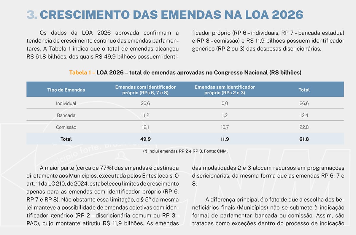 Nesse aspecto, a CNM defende que o remanejamento de parte das emendas e demais transferências discricionárias deve ser compreendido como um instrumento de ajuste de interesse comum, discutido e deliberado pelo próprio Congresso Nacional, destinado a reduzir desigualdades, fortalecer o pacto federativo e garantir maior equidade no acesso aos recursos públicos, especialmente para os pequenos Municípios. Acesse aqui a íntegra do estudo.