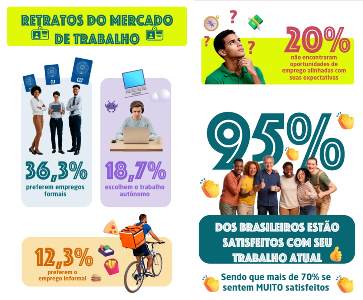 Segundo a pesquisa, 95% dos entrevistados se declararam satisfeitos com o emprego atual, sendo 70% muito satisfeitos. O elevado nível de contentamento ocorre entre os diferentes grupos: empregados, empregadores e autônomos. Apenas 4,6% estão insatisfeitos, dos quais somente 1,6% muito insatisfeitos.