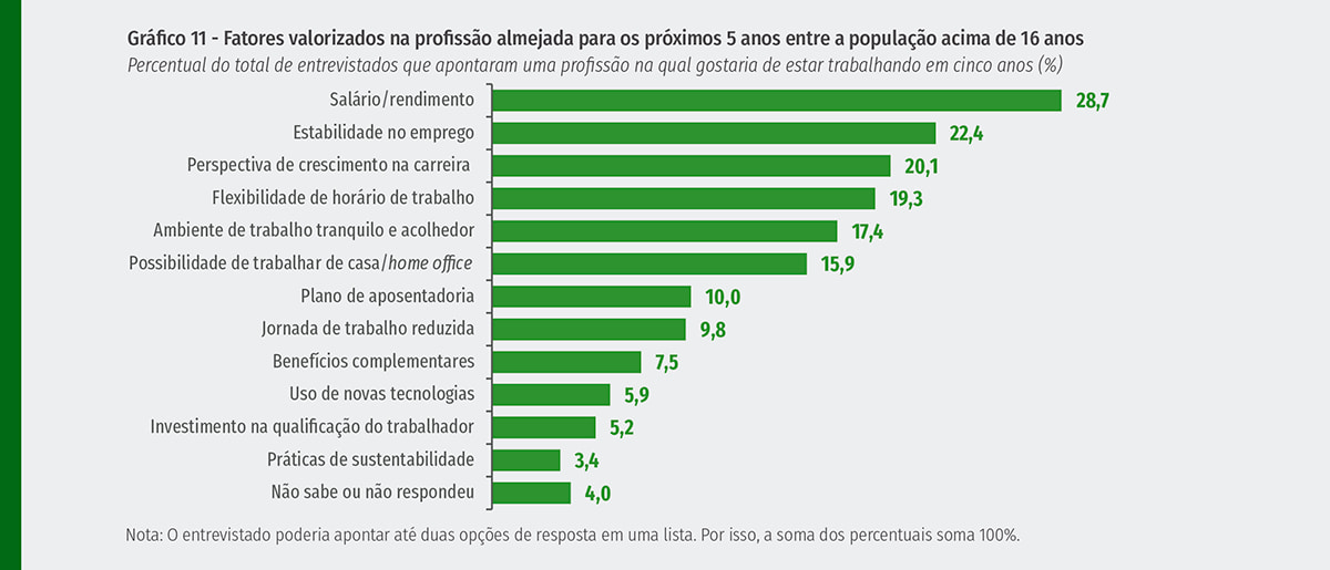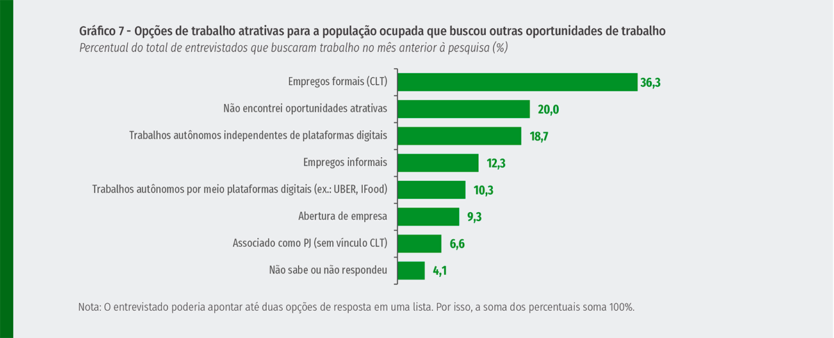 O trabalho autônomo foi apontado como o segundo caminho mais interessante pelos entrevistados (18,7%). A terceira opção mais atrativa foi o emprego informal (12,3%), seguida pelo trabalho autônomo por meio de plataformas digitais (10,3%), abertura do próprio negócio (9,3%) e do contrato como pessoa jurídica (6,6%).