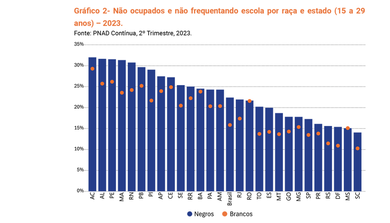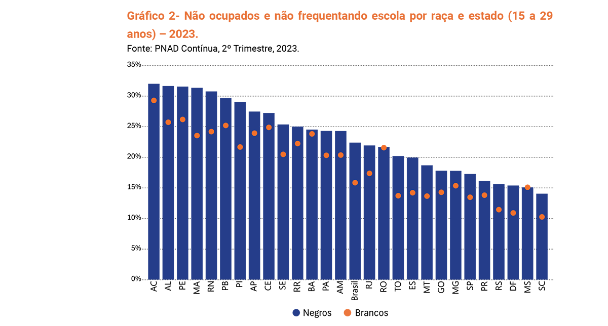 Fonte: Juventudes Negras e Empregabilidade - Desafios estruturais e caminhos para a equidade no mercado de trabalho no BrasilSegundo o estudo, o IEERJN em 2023 era de -0,38 para Pós-Graduação e -0,29 para Ensino Superior. Quanto menor for o índice, maior o descolamento entre educação e inclusão profissional. Já o Ensino Fundamental Completo registrava -0,01 (próximo à equidade) e o Fundamental Incompleto, cerca de +0,15.